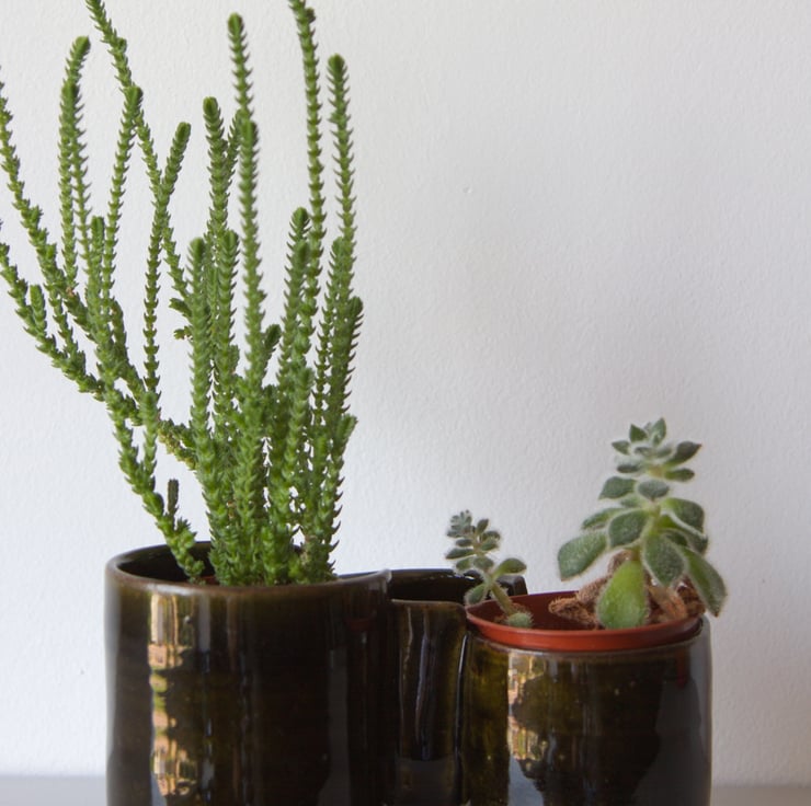 Dark green triple plant pot made to hold three small plants such as succulents or cacti. Each of the three pots are linked up on the inside with the middle one sitting at a different heights to the others.