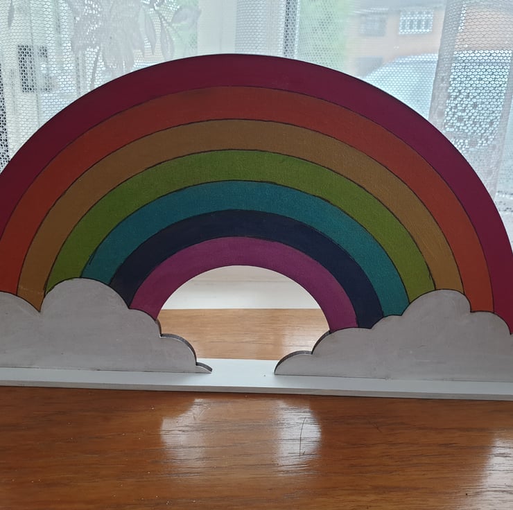 Beautiful mdf rainbow painted in shimmer paints. This rainbow stands about 15cms high and is 30cm long. Beautiful for standing in the window or shelf