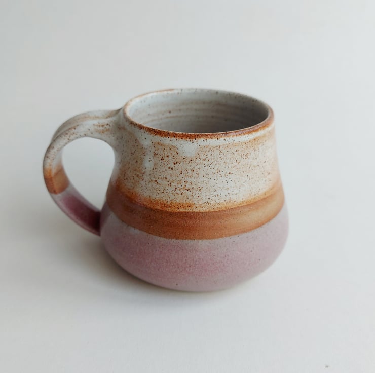 Handmade pottery thrown on my potter's wheel. This ceramic mug is made from stoneware which means it is very durable. The clay gives a biscuit speckled colour which shows through the white gloss glaze and there is a band of un-glazed pottery on the outside to give contrast in colour and texture.