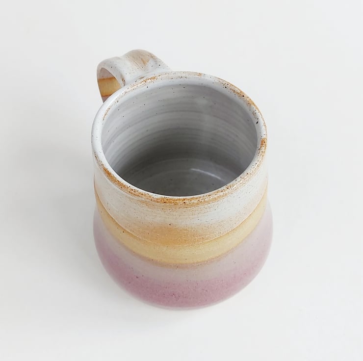 The cup is first thrown then left until it is leather hard, then turned and the handle is added as well as my makers mark. Once dry it is bisque fired then 2 glazes are applied and it is fired again to 1220 oC. All glazes are lead free.