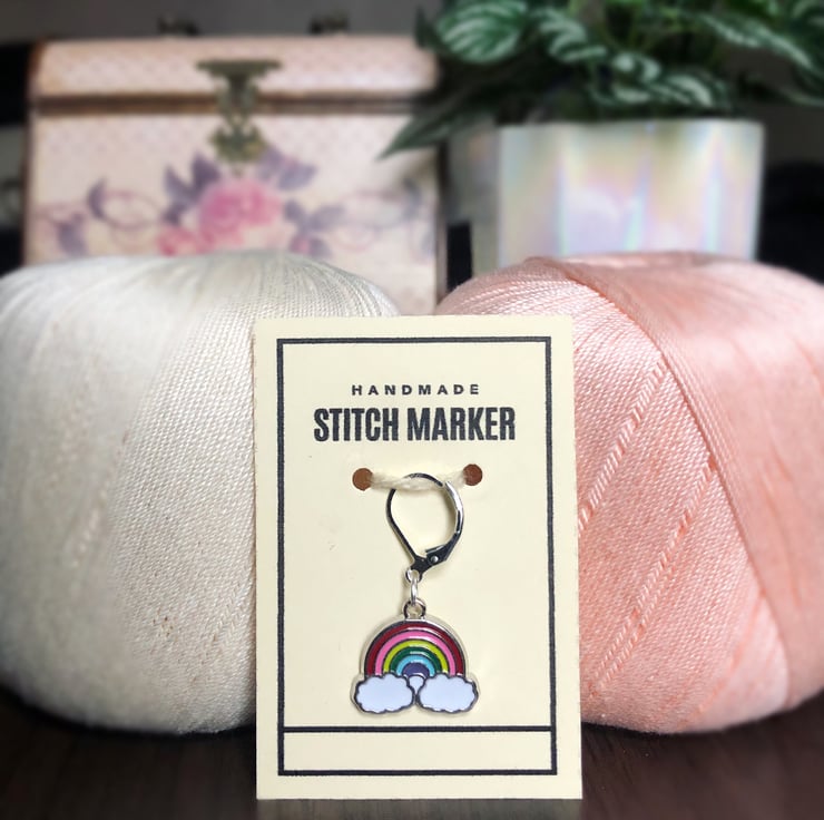 Enamel rainbow stitch marker for knitting or crochet, with silver plated findings. You can choose either a lobster claw clasp (as in the cover photo) or a larger lever back clasp, depending on your personal preference. The charm is single sided and has a plain silver back.