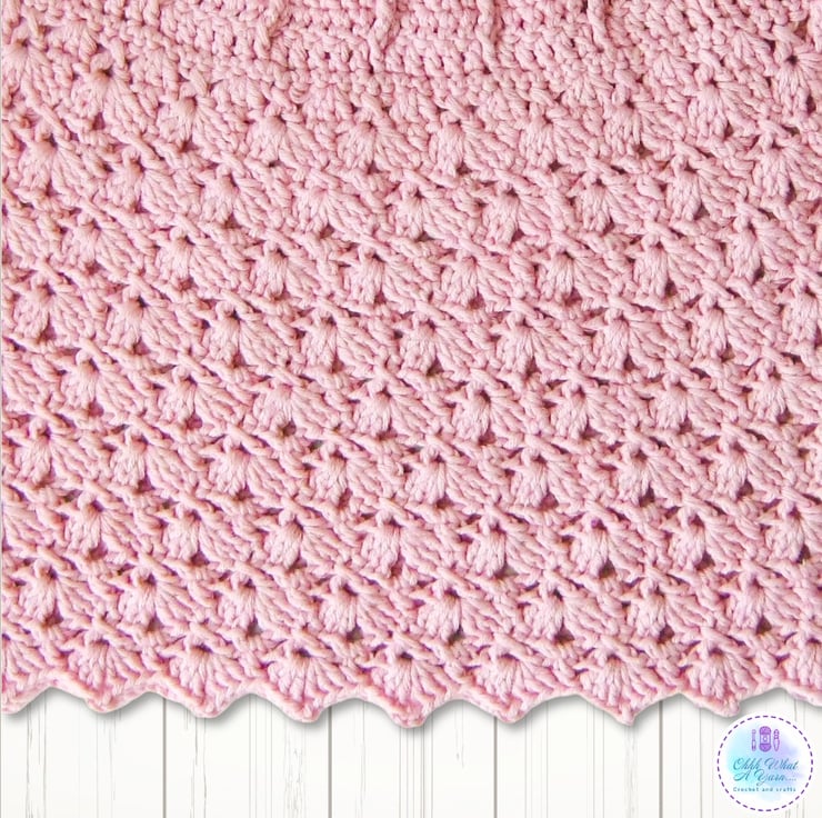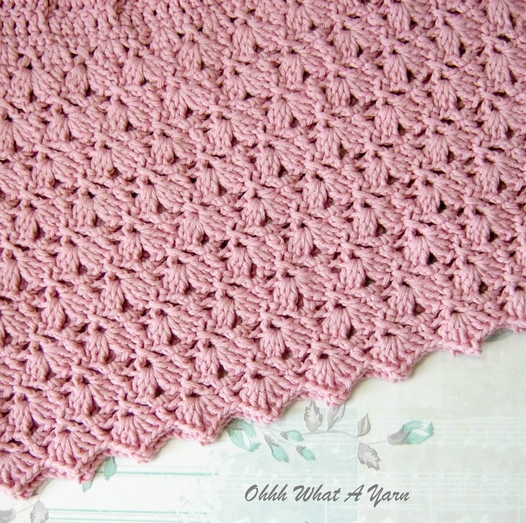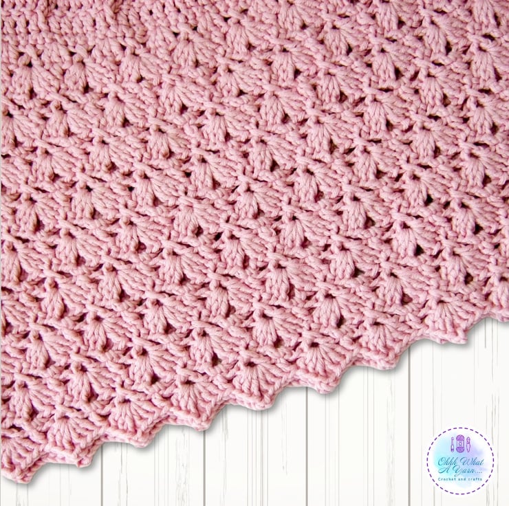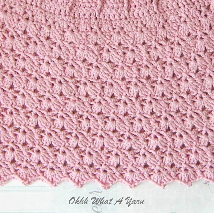 The body of the dress has a lovely shell and lacy pattern and it has the same decorative shell edging along the bottom.