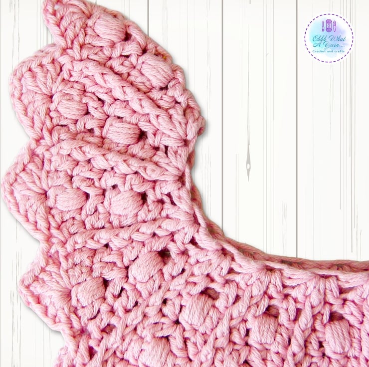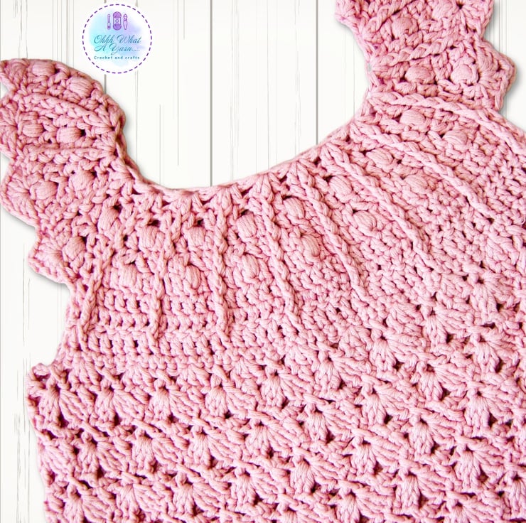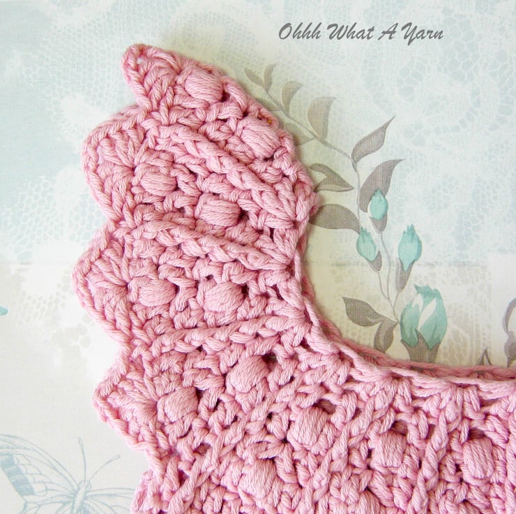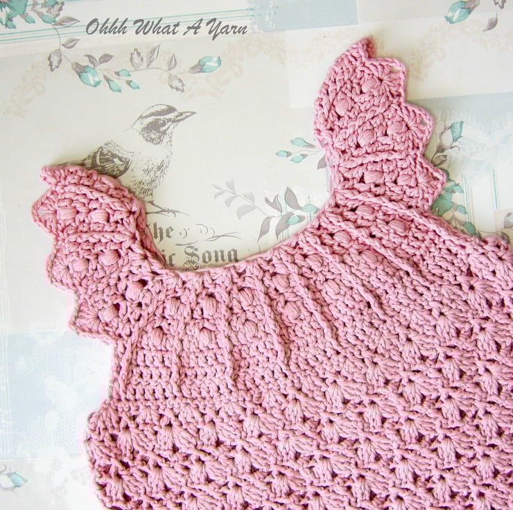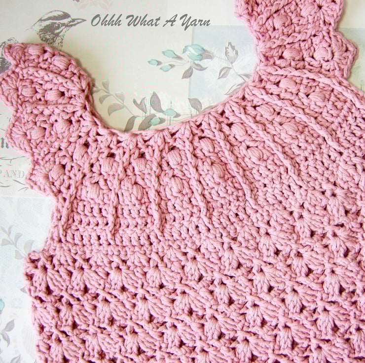 It has a pretty bobble and rib yoke and a decorative shell edge around the armholes.