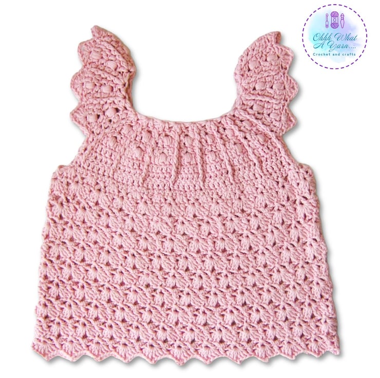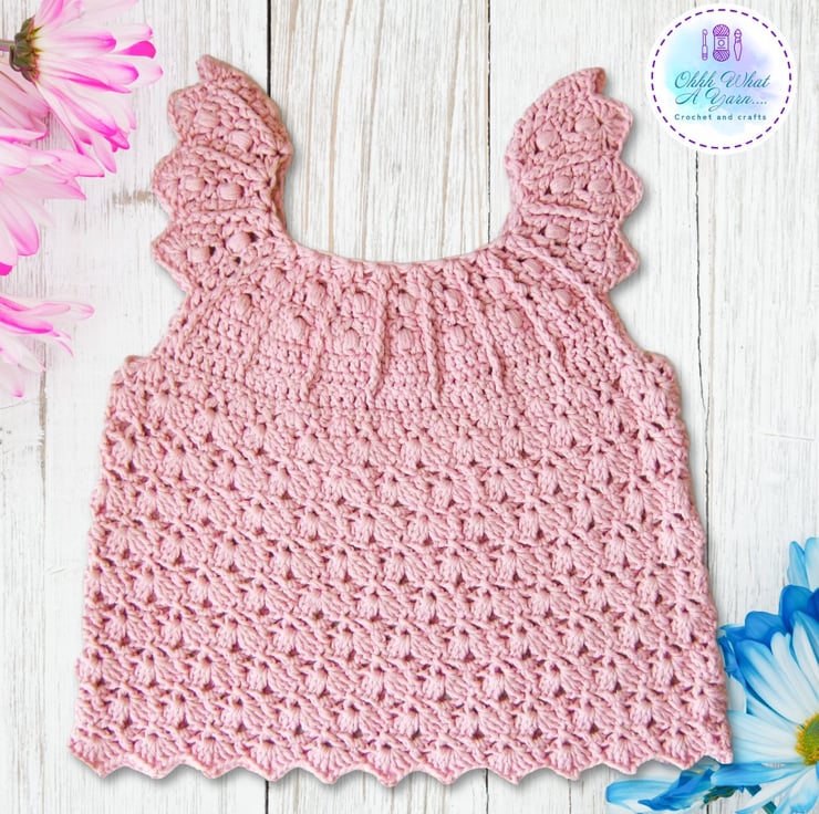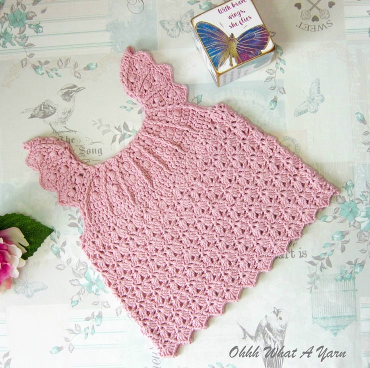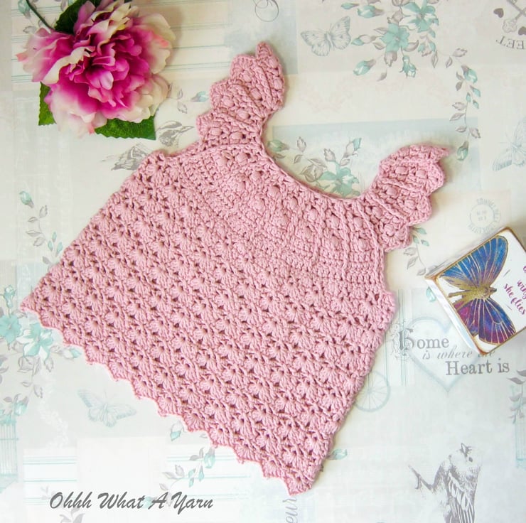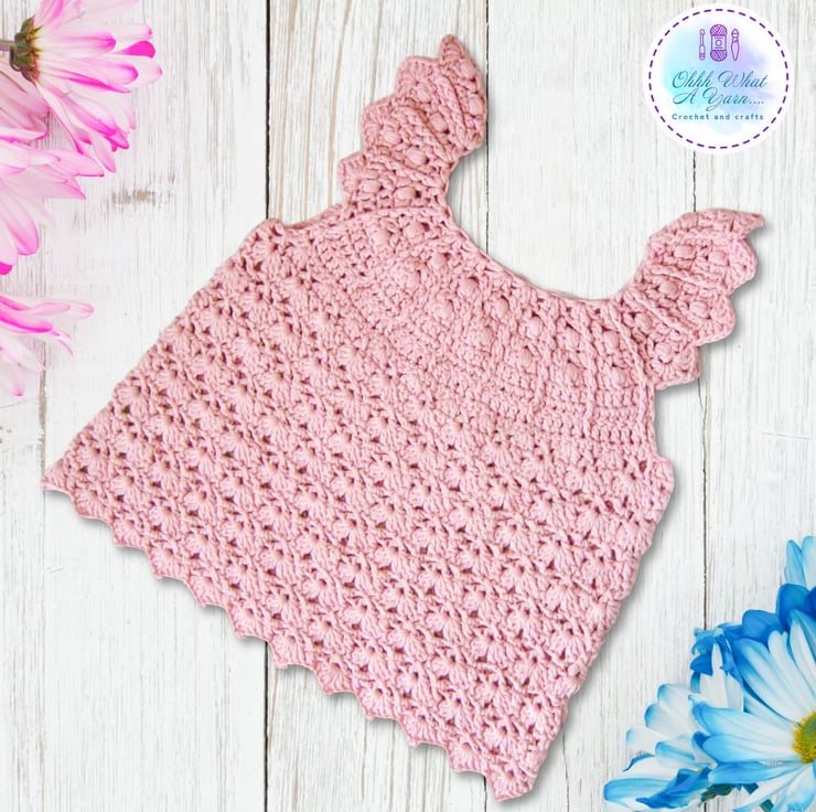 This gorgeous pale dusty pink baby sun dress has been crocheted using gorgeous Drops lightweight 4 ply 100% cotton yarn.