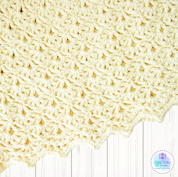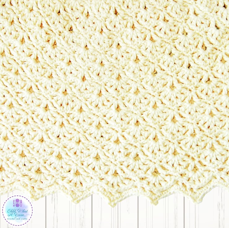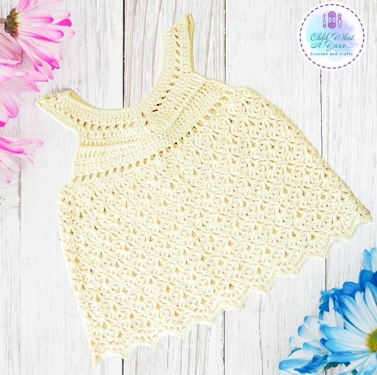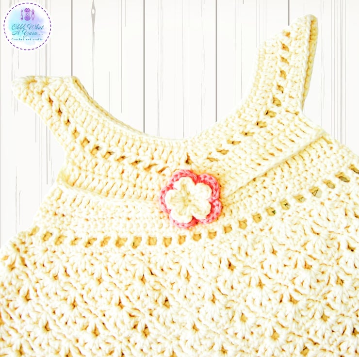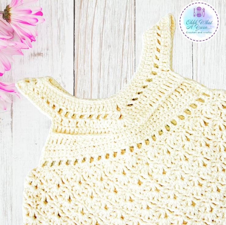 The body of the dress has a lovely shell and V stitch lacy pattern and it has a pretty shell and picot decorative edging along the bottom.