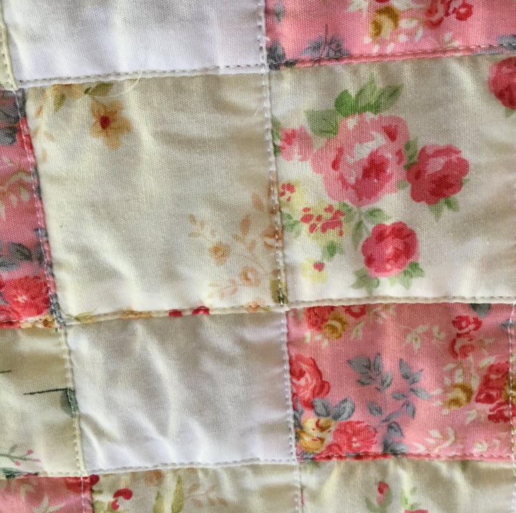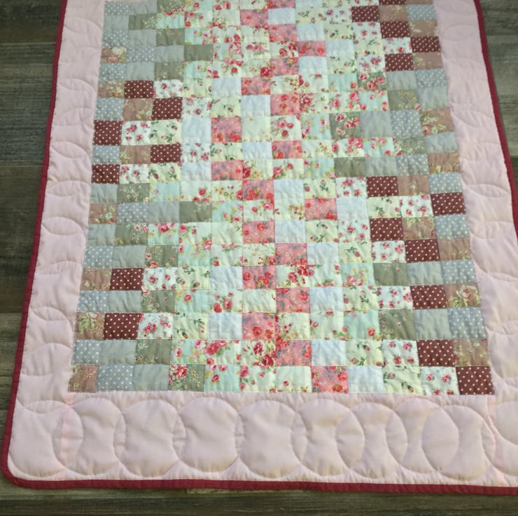 Pretty cot quilt, made with tiny squares in a selection of patterned plain and dotty fabric, the reverse is covered with a pretty ditsy print fabric.
