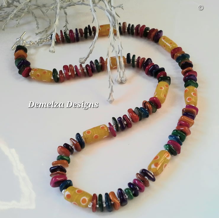 A beautiful funky rainbow necklace designed and hand made using irregular square cut infused dyed genuine mother of pearl. Between each decorative hand blown glass beads are silver plated beads and between each mother of pearl are tiny clear seed beads to add extra sparkle during wear around the neckline. For the main construction professional coated stainless steel jewellers wire has been used for added strength and lasting durability, finished off with a small toggle style clasp.