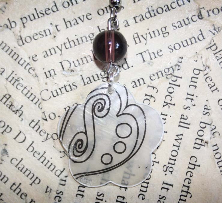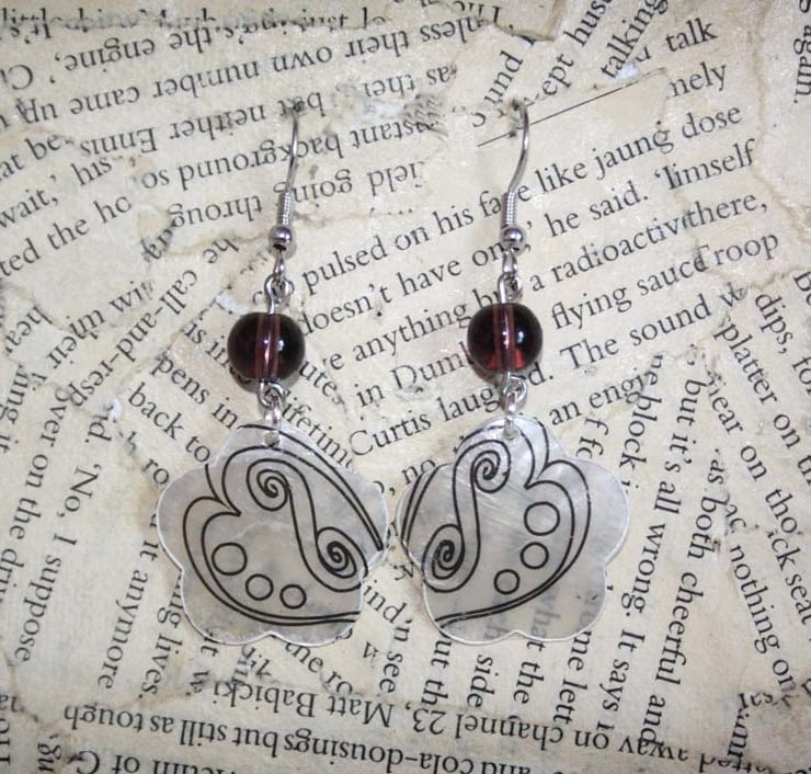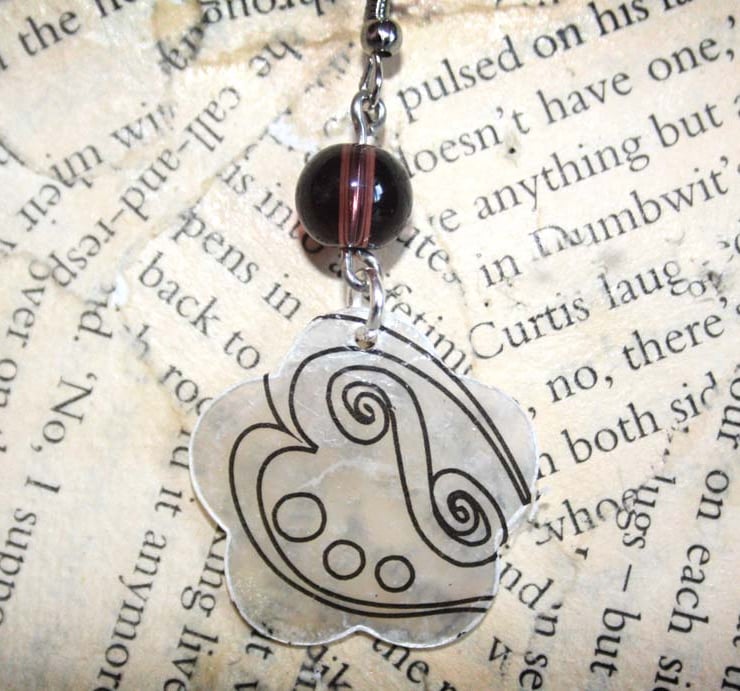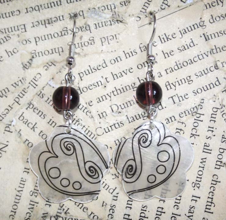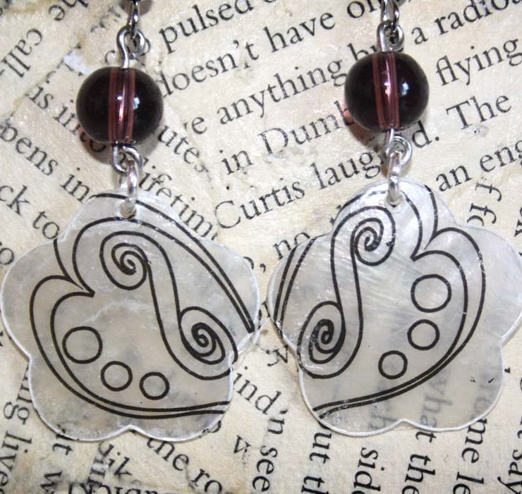 Made from flower shaped seashells and plastic beads, these earrings are incredibly lightweight. A transfer has been applied to the shell and sealed with a clear coat of mod podge.