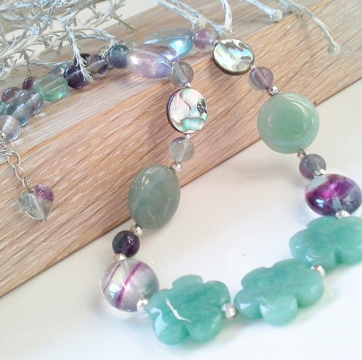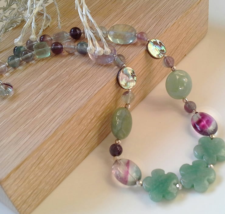 A stunning eye catching necklace designed and hand crafted using exptional quality genuine rainbow fluorite gemstones complimented with green flower cut genuine aventurine and abolny shell from New Zealand.