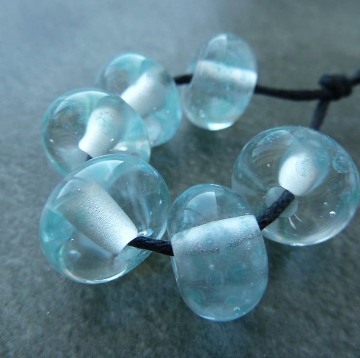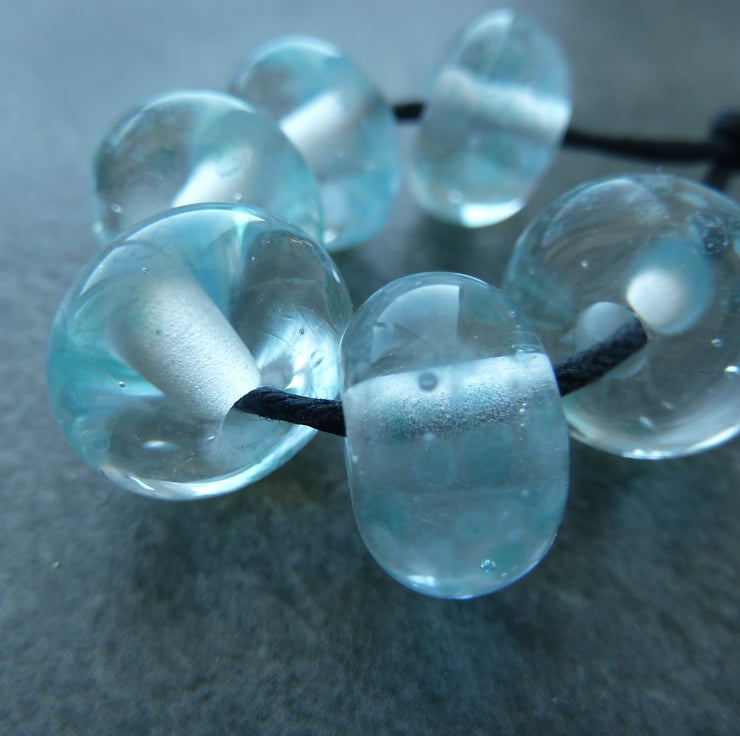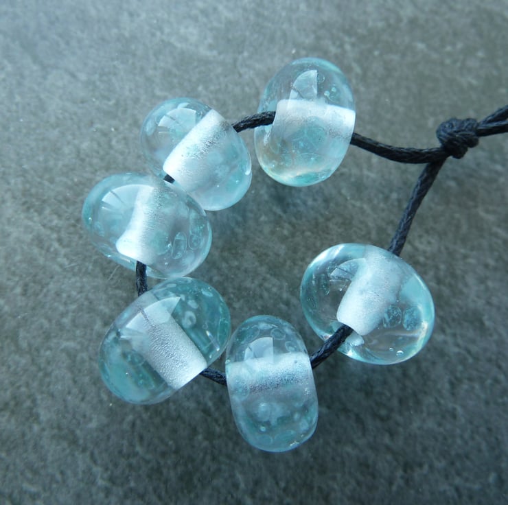 A set of 6 lampwork glass beads made with clear glass and rolled in frit, the frit features light blue and clear glass.