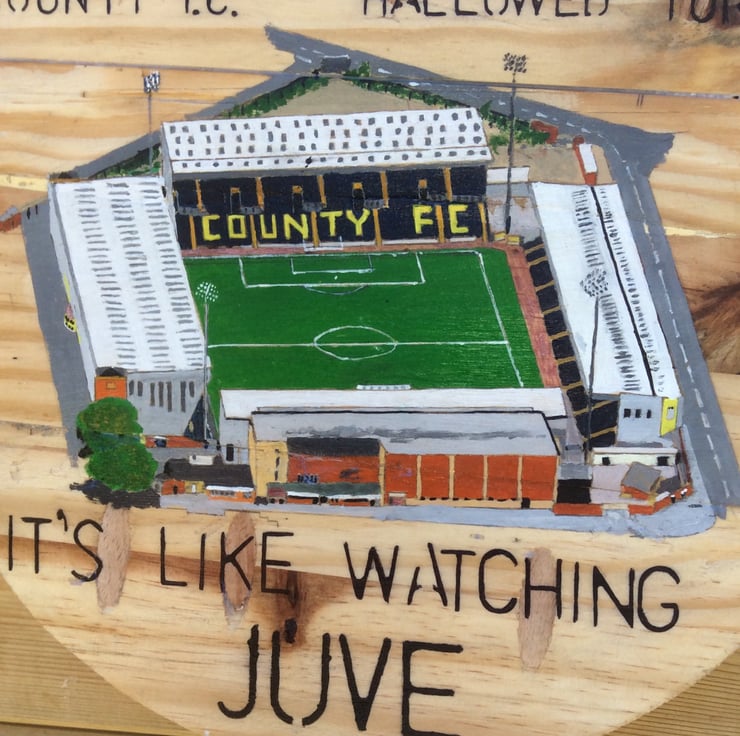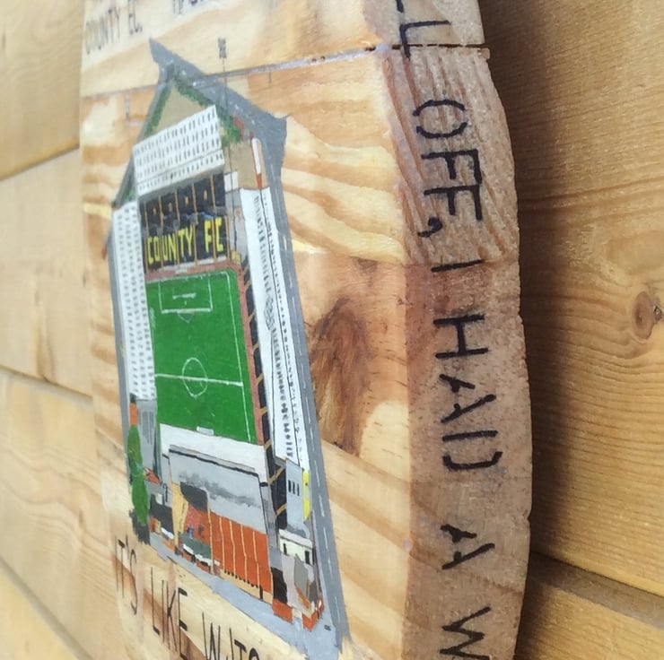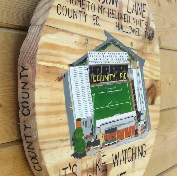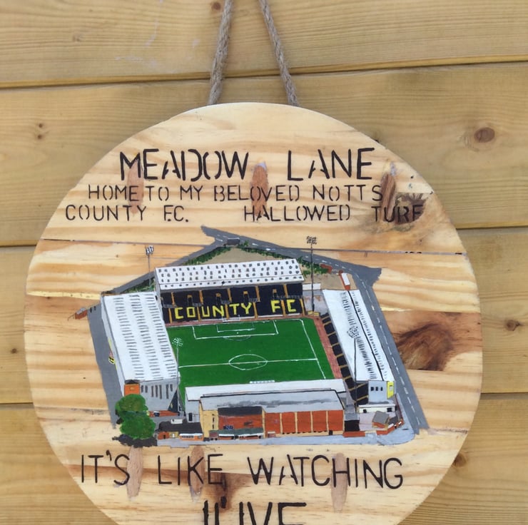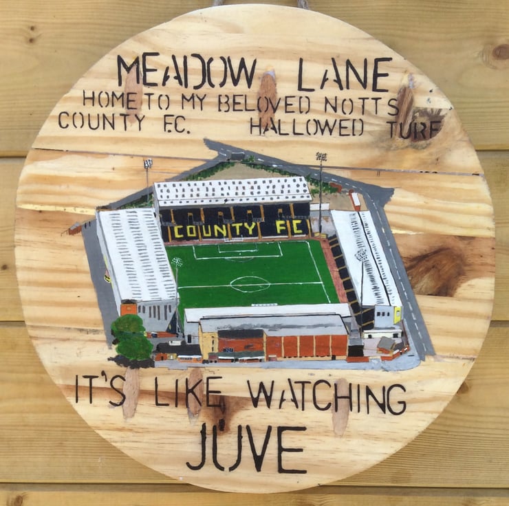 The wording on the face is as follows: MEADOW LANE home to my beloved Notts County. Hallowed Turf. / IT’S LIKE WATCHING JUVE.
