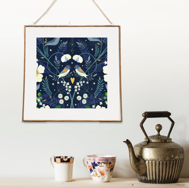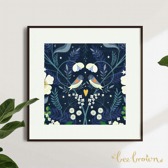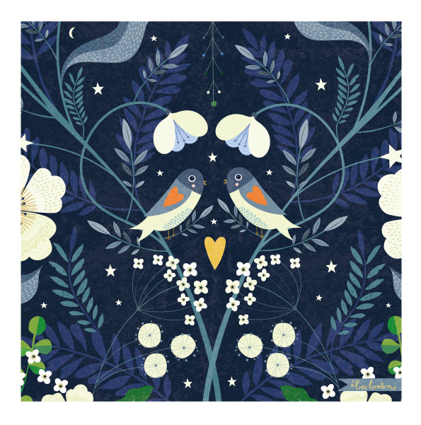 I love to make drawings that reflect the change & feel in the seasons and use the natural world as inspiration. I was creating some designs for fabric and noticed that these little birds were contained within a heart shape. I decided to crop my image and make a print focused on these two little folky birds in love!