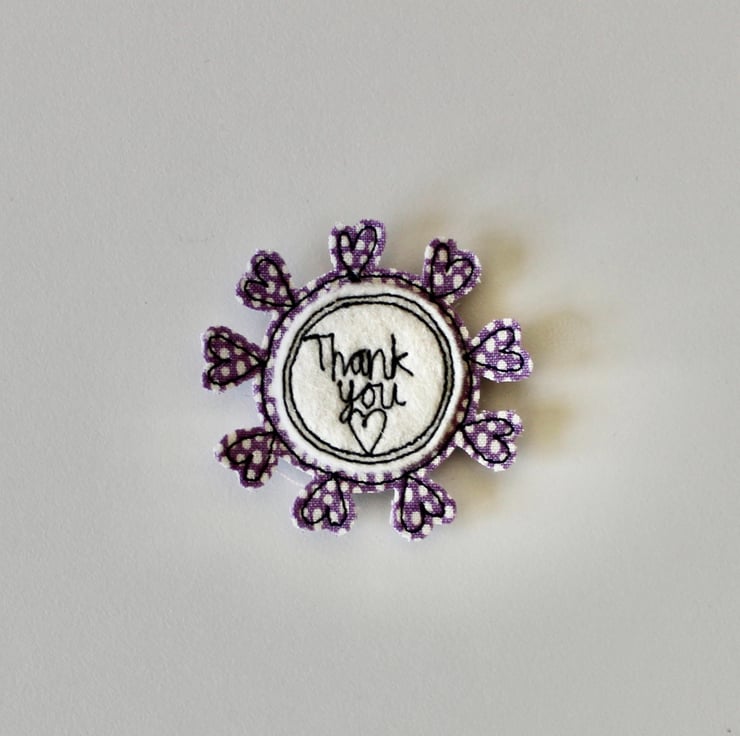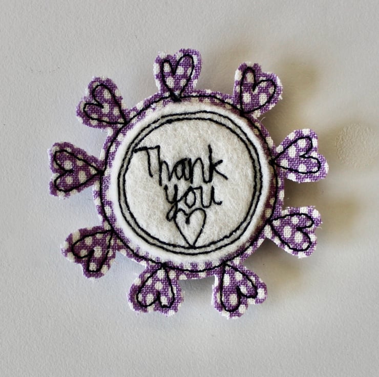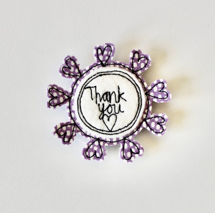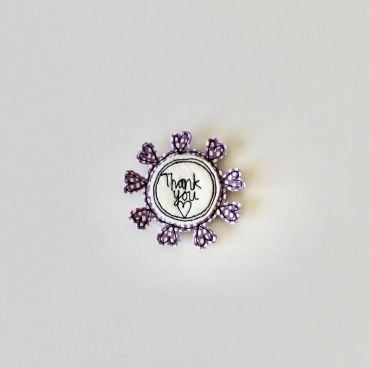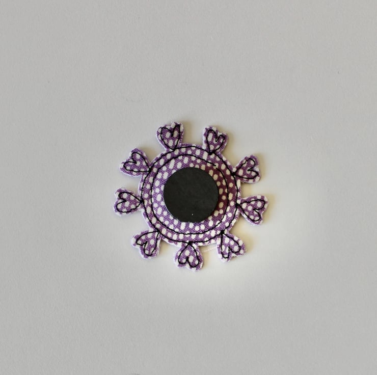 Each magnet is created using multiple layers of cloth, sewn using freehand machine embroidery and then cut out by hand. The magnet on the back is attached with hot glue.