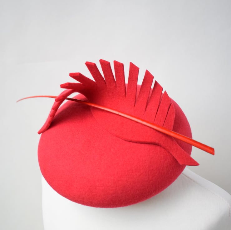 This striking red couture hat with curled felt feather and quill trim is the perfect headpiece for your next wedding, race day event or formal occasion.