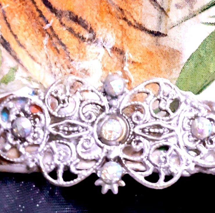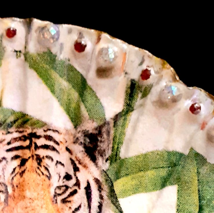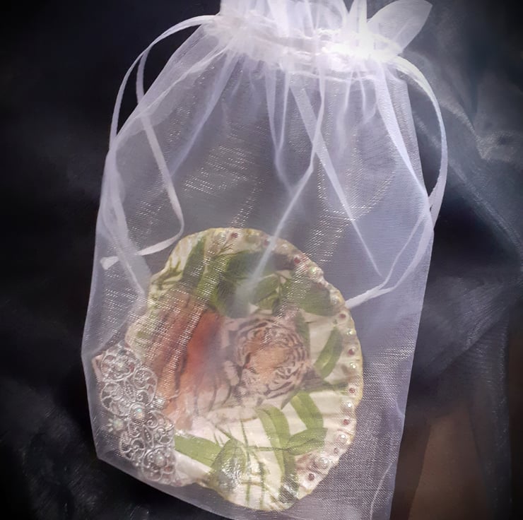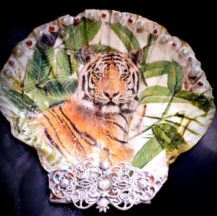 This is a unique little trinket dish created from a Cornish scallop shell which could also be used as a tealight holder ..The shell has been decoupaged with an image of a tiger in a jungle ...the image enhanced with artist's professional coloured pencils and it has been decorated with acrylic beads and a silver tone metal embellishment...and dish has been well protected with layers of waterproof varnish...the approx size of the dish is 3 and half ins long and 4 ins wide at its widest point
