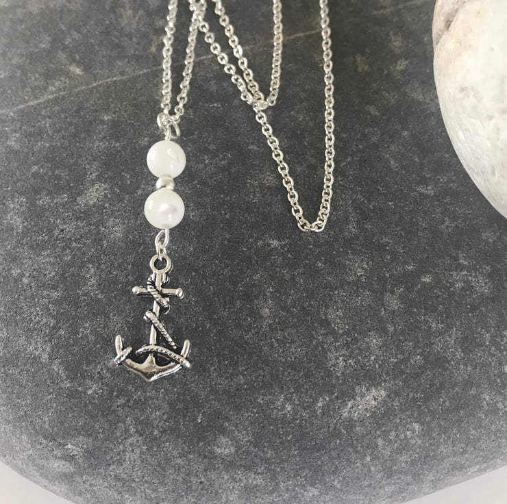 Handmade pretty necklace made with 6mm Mother of Pearl white beads and a silver plated anchor charm.