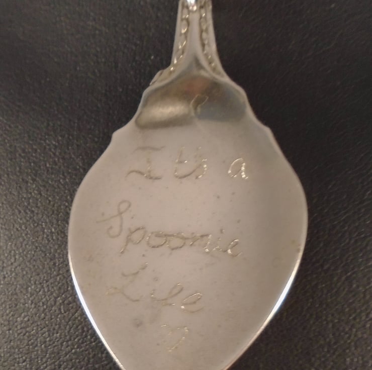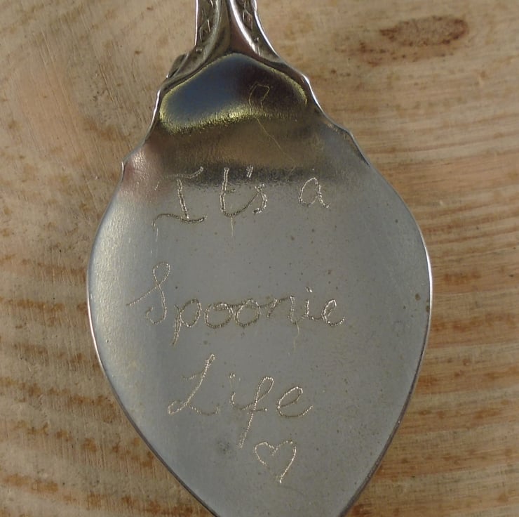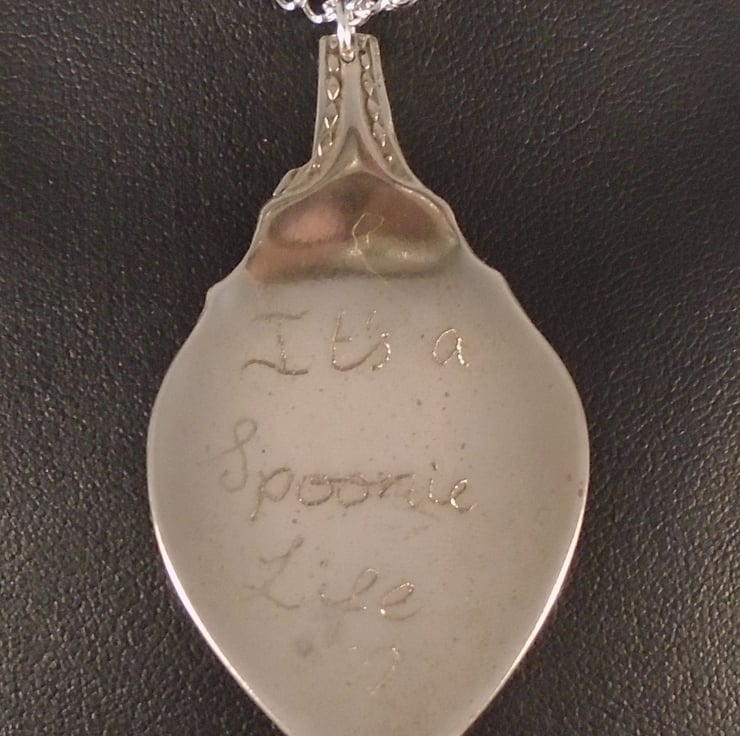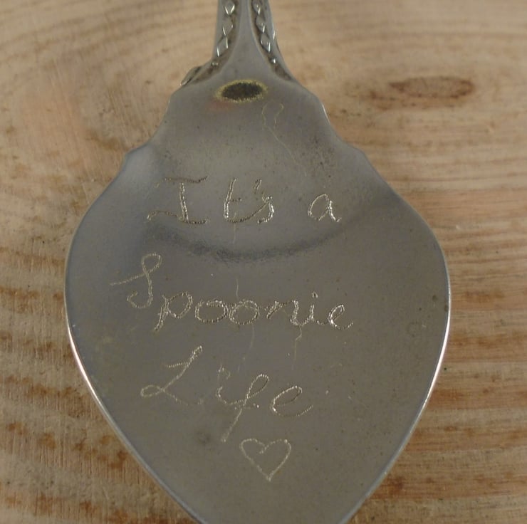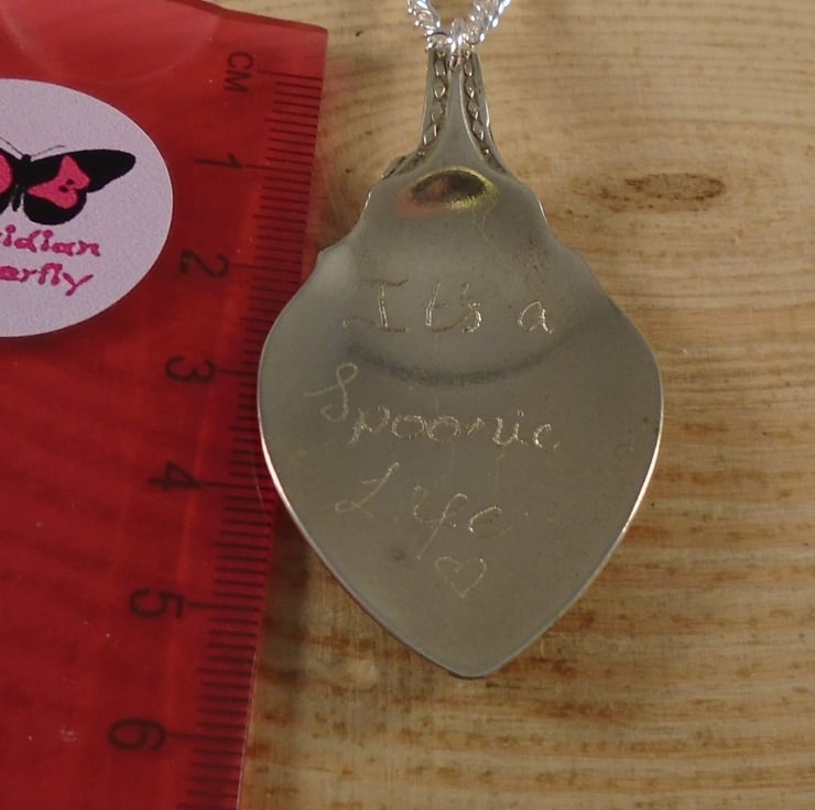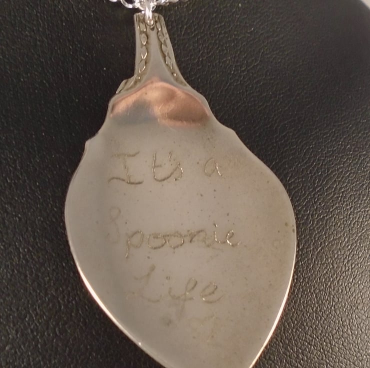 The handle of the jam spoon has been sawn off, and a hole has been drilled in the remaining handle for a loop for the chain. The bowl of the spoon has then been hand engraved with 'It's A Spoonie Life'.