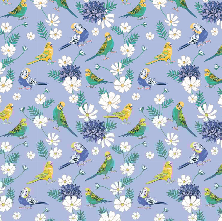 Pretty blue pattern featuring lots of colourful budgerigars and garden flowers.