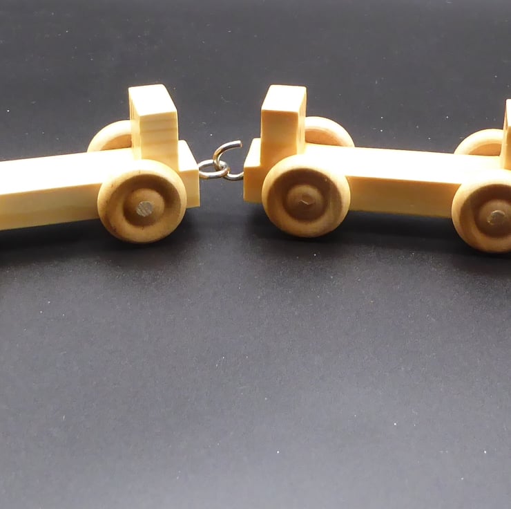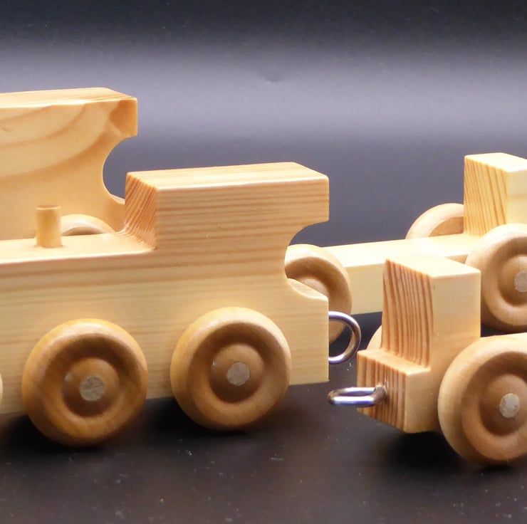 Toy Train in Natural Pine - a firm favourite with all small children! Engine, 2 trucks and guards van, approx overall length 42cm. Constructed in solid Pine, with Birch wheels and securely fixed steel couplings. Finished with child safe gloss varnish for a hard wearing surface which will wipe clean, and resists the knocks and scuffs of young children's play.