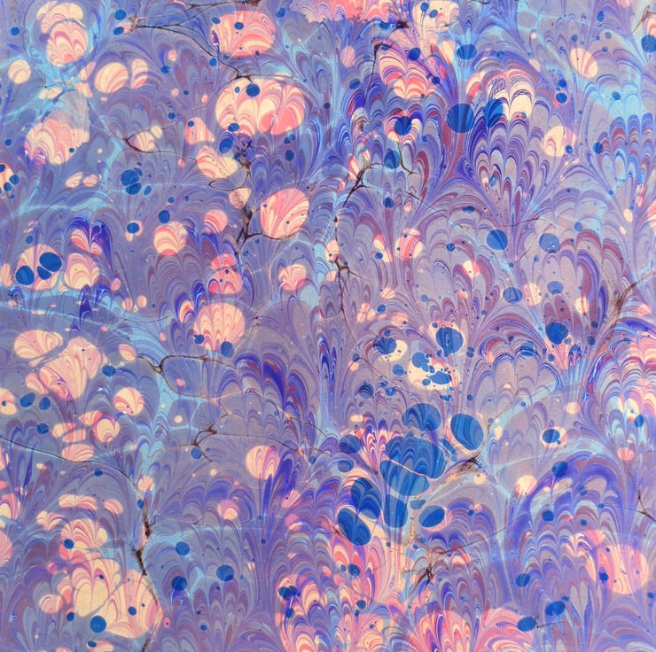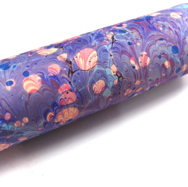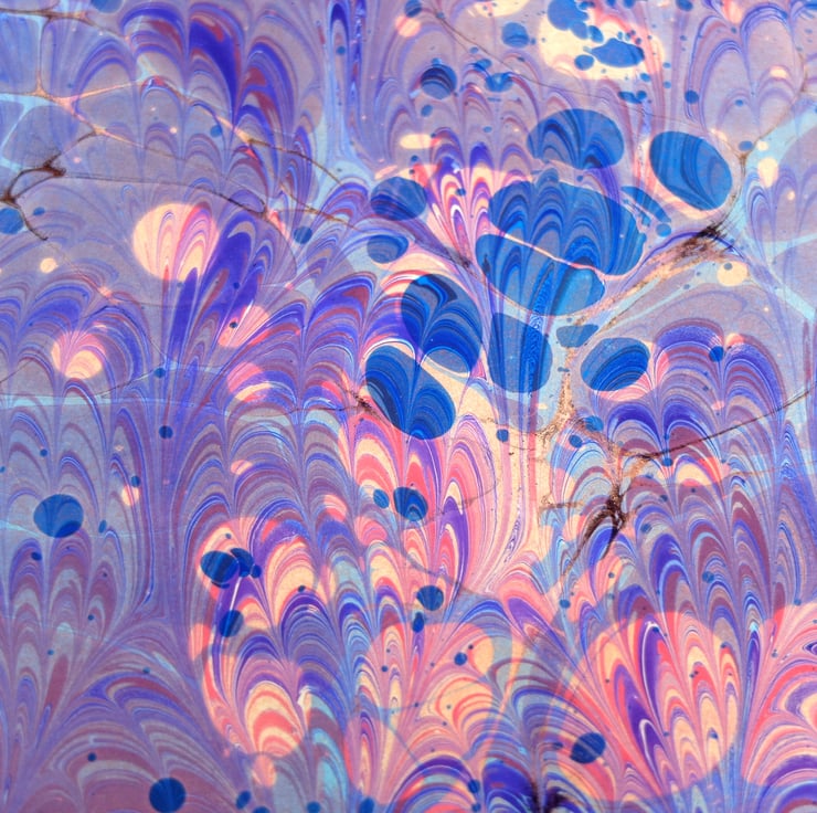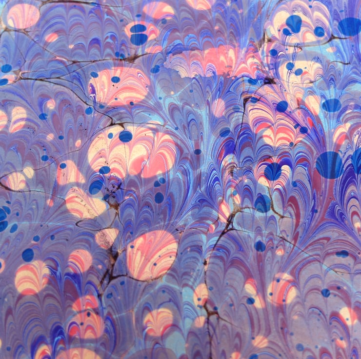 This is a gorgeously coloured pink purple and blue very slight second double marbled a4 sheet of paper which has been marbled with a stone pattern first, and then a peacock pattern on top.