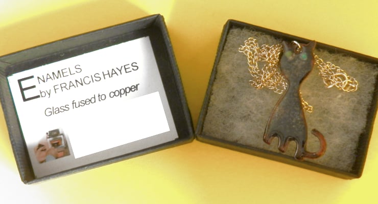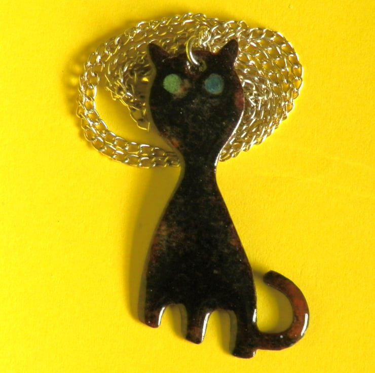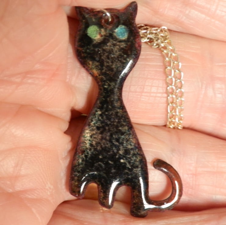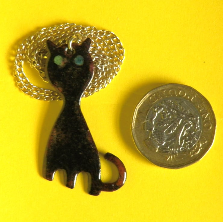 This cat pendant is enamelled black over clear enamel. The copper base shows through, glinting golden brown and shifting in response to different directions from which the light strikes it. This creates a tabby effect. To make the cat's eyes I have fired two domed beads to the pendant. And, yes the eyes are one green and one blue.