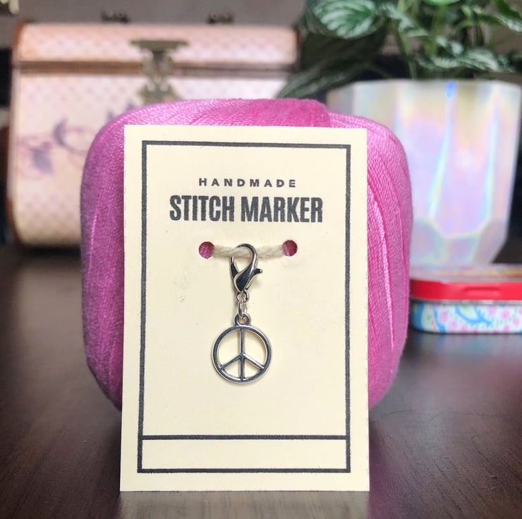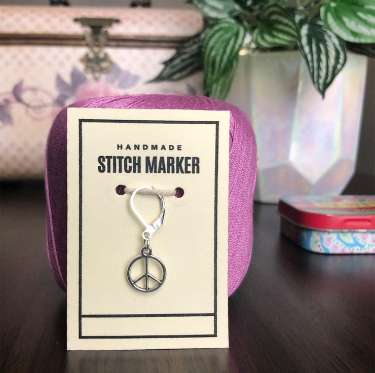 Peace Symbol/Ban the Bomb stitch marker for knitting or crochet, with silver plated findings. You can choose either a lobster claw clasp (as in cover photo) or a larger lever back clasp (second photo) depending on your personal preference. The charm is double sided and light weight.