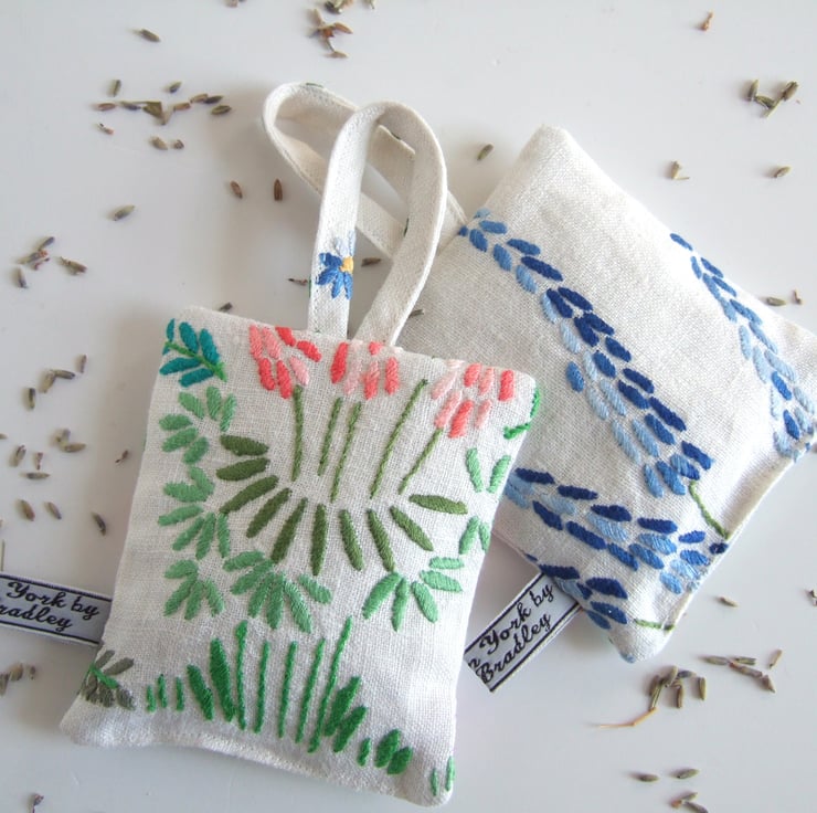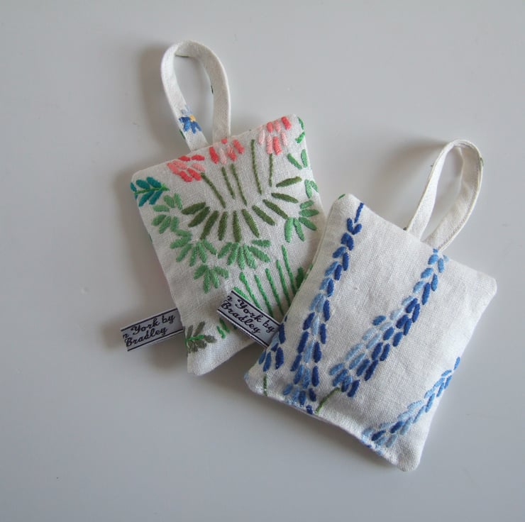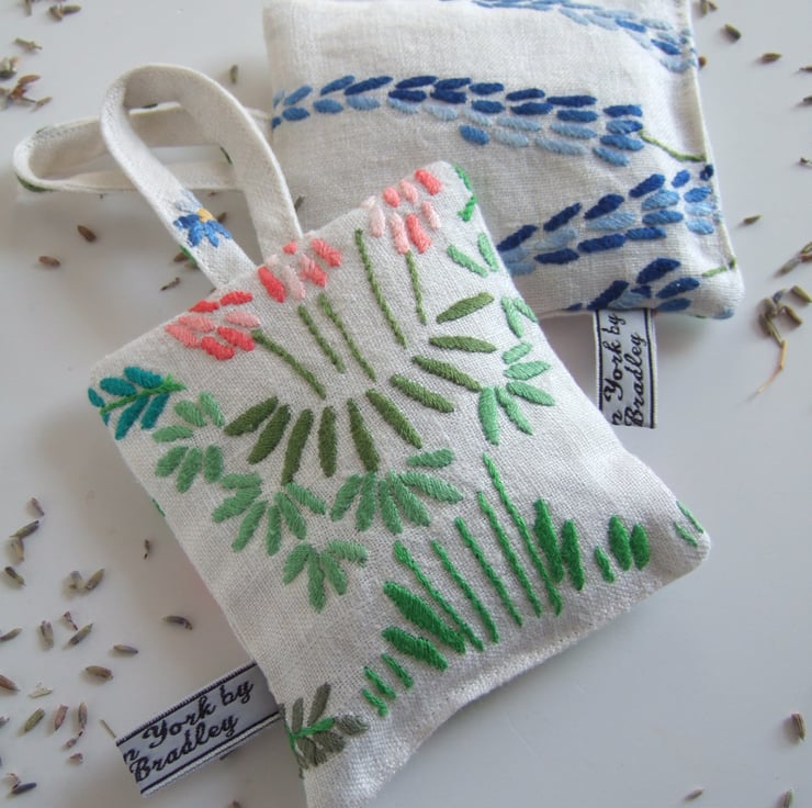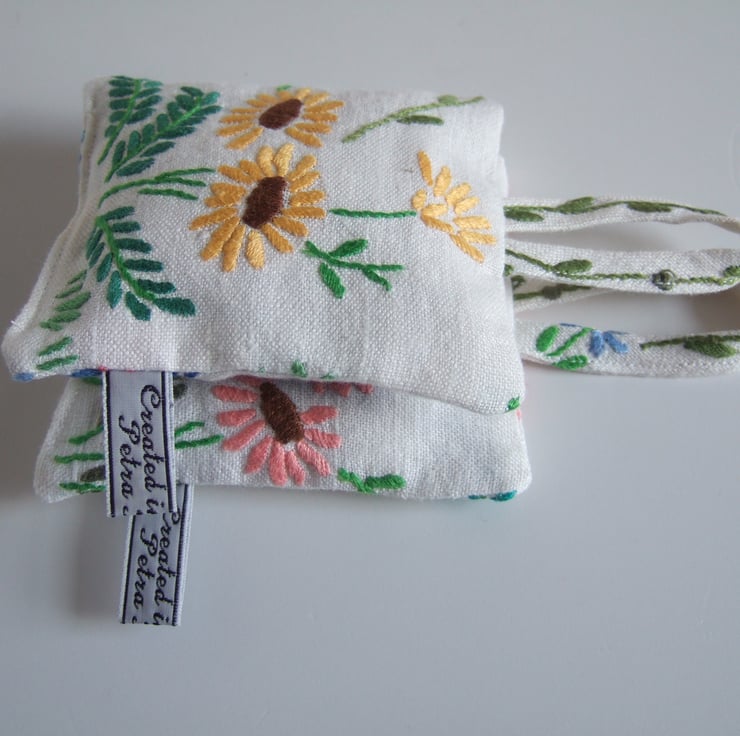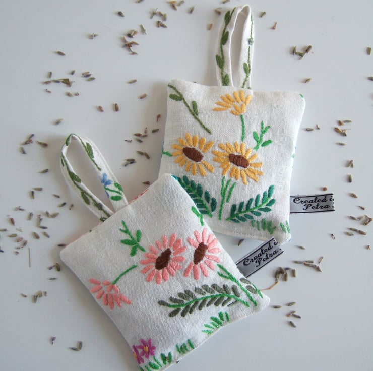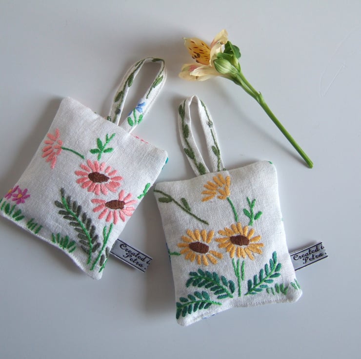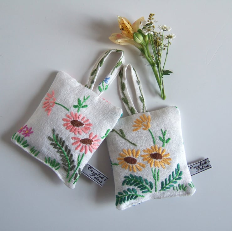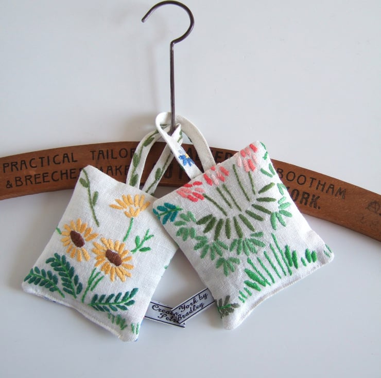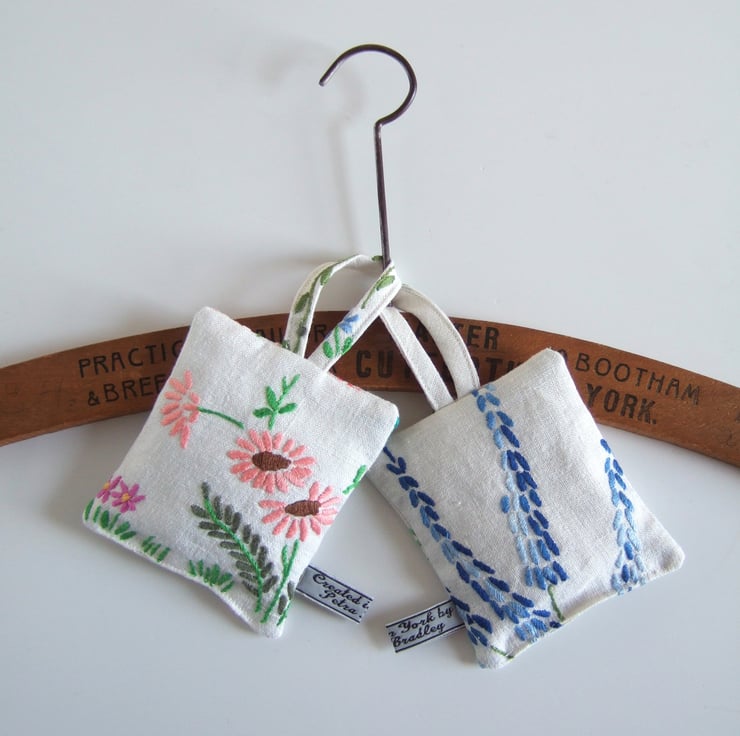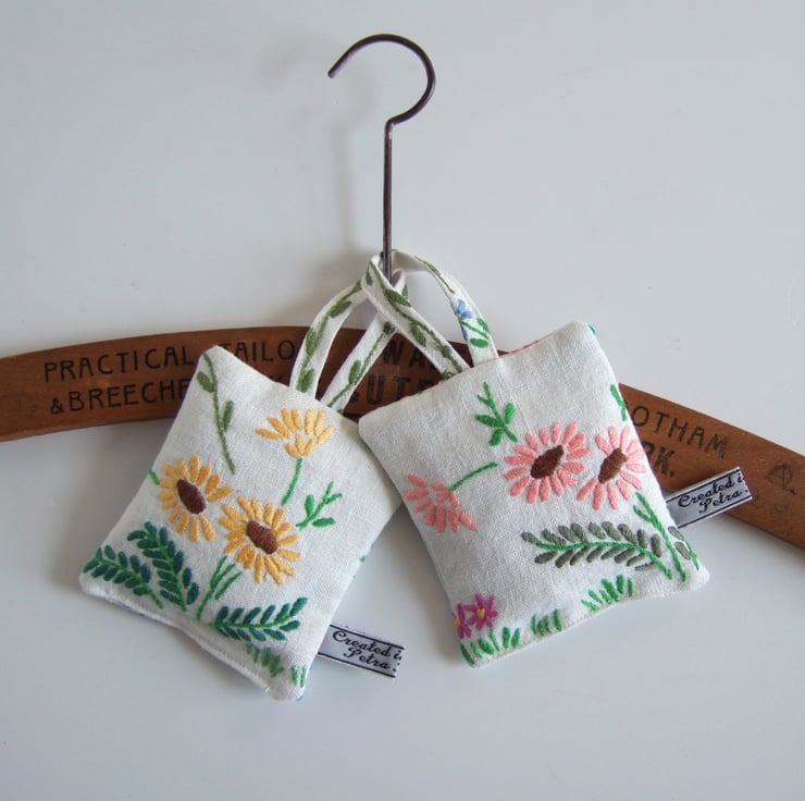 Lovely lavender, used for centuries to scent clothes, give you a good nights sleep, and keep away pesky moths. Pop them in a drawer for sweet smelling linens. This pretty duo of lavender bags are made from the corner of a vintage tablecloth, and stitched with old fashioned daisies. I couldn’t bear to split them up, so I am keeping them together in a pair. These would make a lovely housewarming present, as a gift for anyone learning to embroider, or to send a virtual hug to a friend.