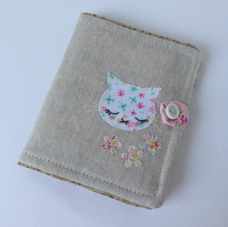 Sweet little hand stitched needle book, with an adorable hand embroidered kitty on the front.