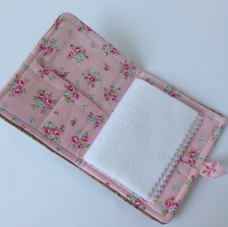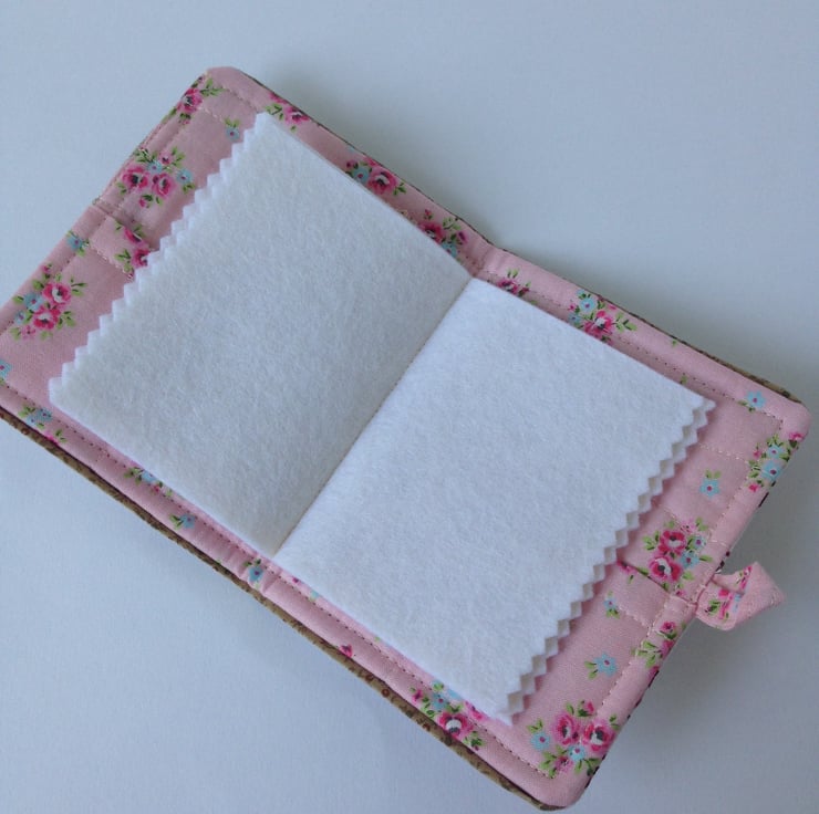 This needle book is the ideal place to keep your needles and pins safe. It has four pages of felt and two pockets on each side for holding floss etc.