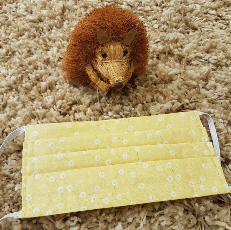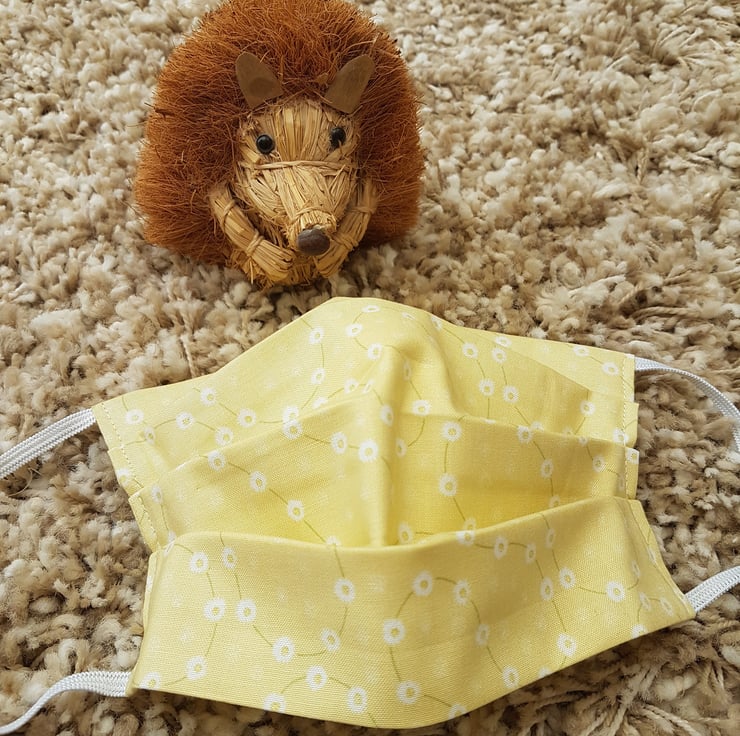 Small Adult/Teenager face covering made from a daisy chain print on lemon cotton. The face mask is made with 2 layers of cotton forming an inner pocket for a filter (not included) and is fastened over the ears with 2 loops of elastic.