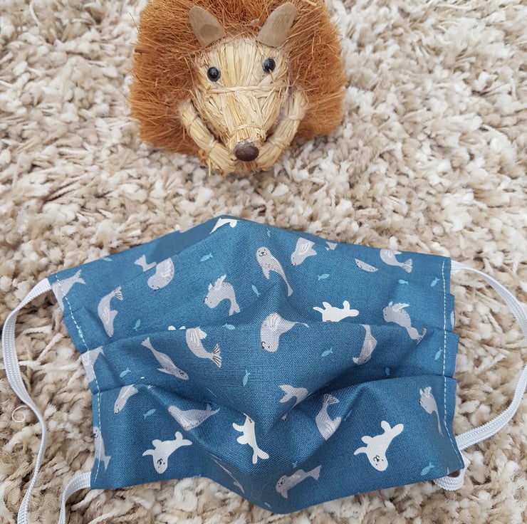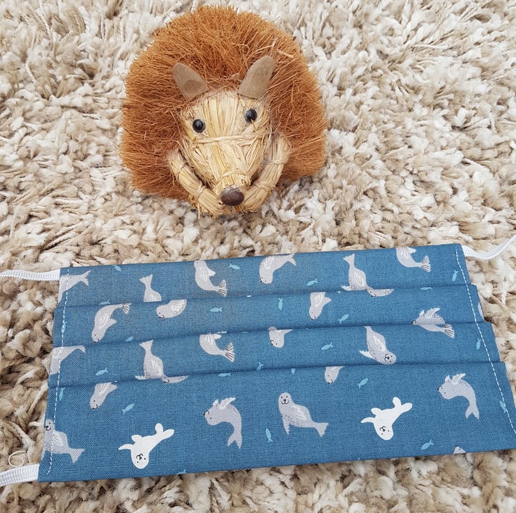Small Adult/Teenager face covering made from a seal print on blue cotton. The face mask is made with 2 layers of cotton forming an inner pocket for a filter (not included) and is fastened over the ears with 2 loops of elastic and a toggle adjuster.