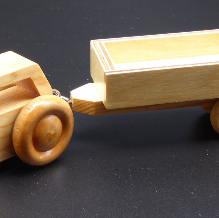 Wooden Tractor and Trailer in Pine and Birch Plywood with securely fixed bright steel coupling. overall length approx 21cm. Natural woodgrain with child safe gloss varnished finish, which is hard wearing, wipe clean, and will withstand the knocks and scrapes of children's play. Suits age 2yrs plus