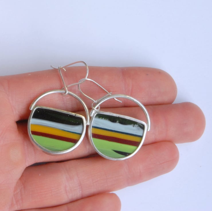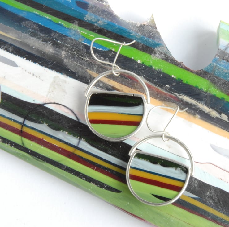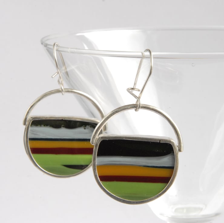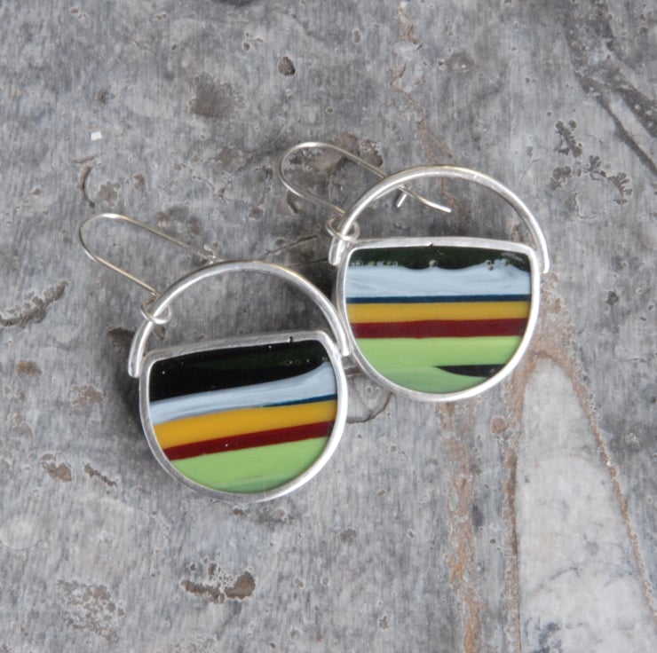 These statement earrings feature semi circles of cornish surfite which has been bezel set in sterling silver, the remainder of the circle has been outlined using silver wire and the safety hook is looped round this arc. The hooks move freely on the arc so these earrings have lots of lovely movement but always return to the right orientation thanks to the weight distribution.The surfite has an uneven pattern of stripes in green, red, yellow, grey and black, to me they look like little mountain landscapes. There are dimples in the surface where the layers meet from air bubbles that were trapped as the surfite formed. These earrings measure 39mm by 25mm but surfite is fairly lightweight. Comes gift boxed.