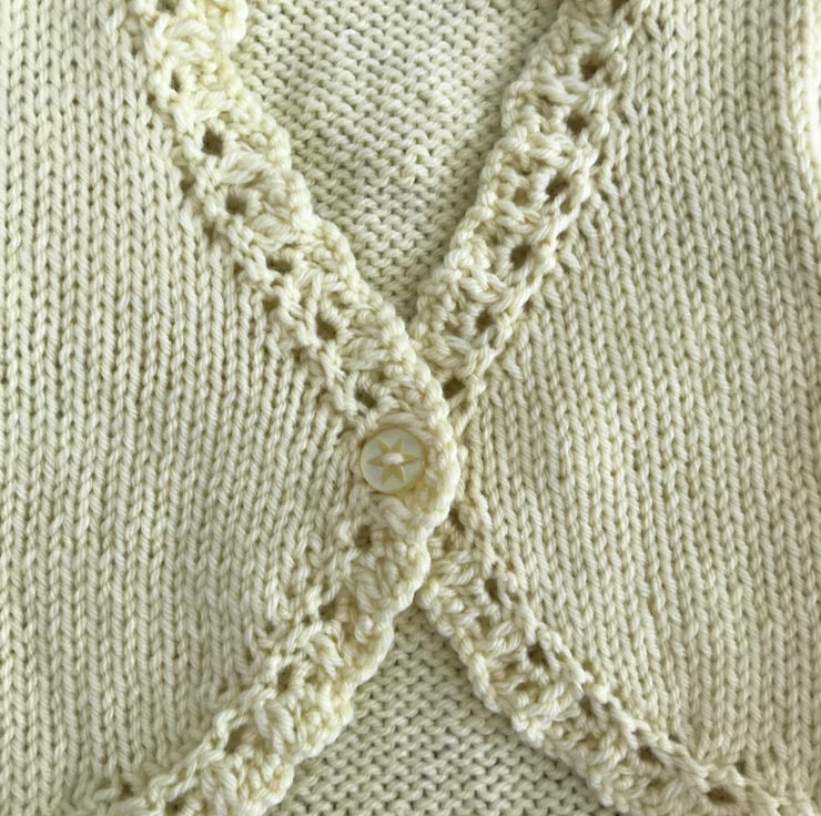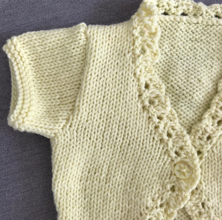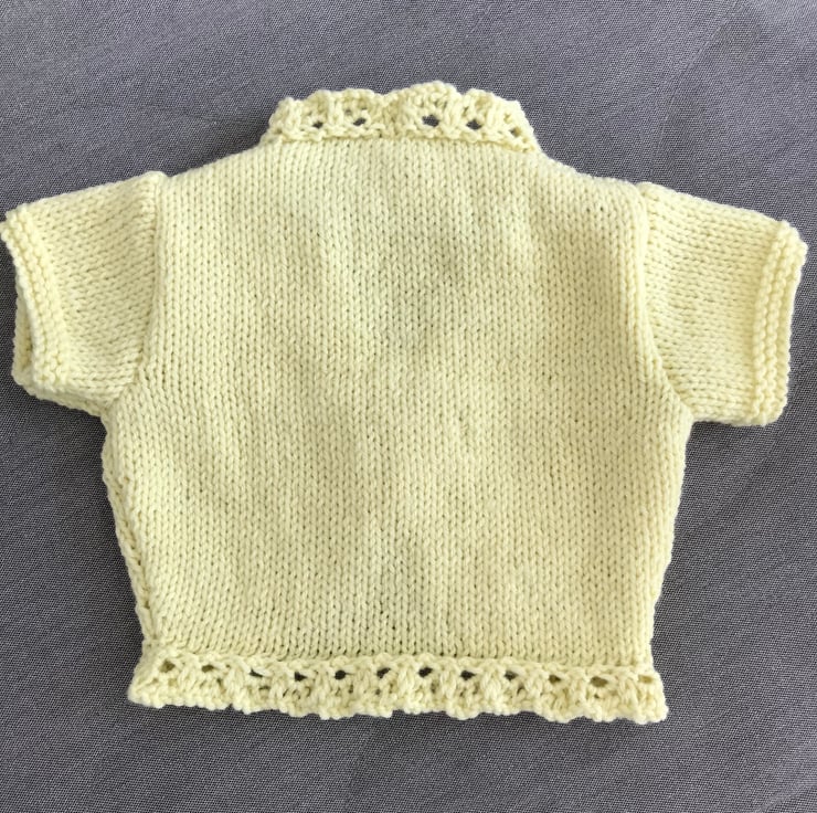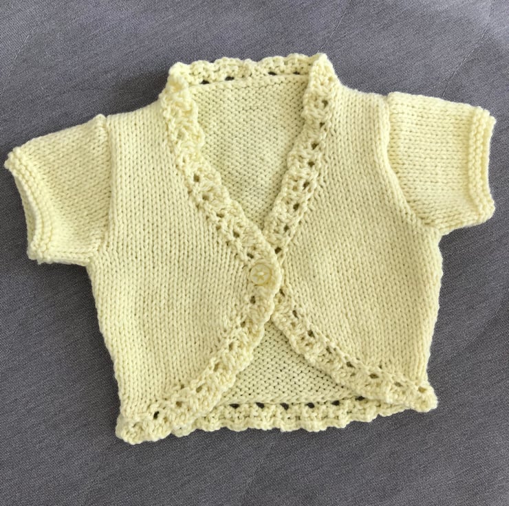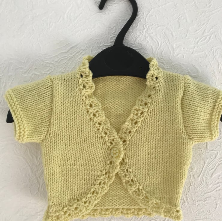 A hand knitted bolero worked in a soft baby yarn. It has a knitted curved edging and fastens at the front with a button.