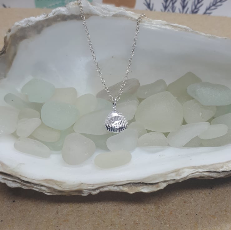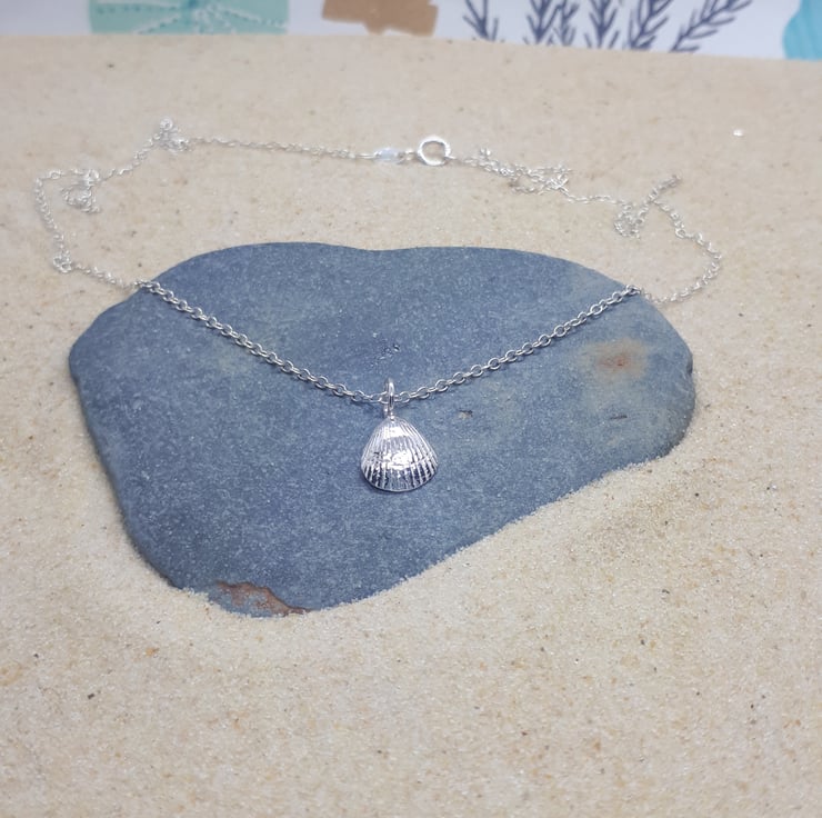 A medium fine silver cockle shell pendant on a sterling silver trace chain.