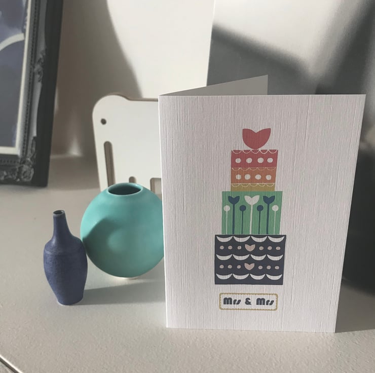 Inspired by Scandinavian patterns this beautiful rainbow wedding cake card is perfect any wedding but would be perfect for an LGBT wedding. The striking array of rainbow colours across the simple soft graphic pattern give this design a feeling of hope and expectation. A high quality inkjet print on 260gsm premium quality linen textured white card this A6 card also comes with a beautiful steel grey envelope. The cards and envelopes are bound by a simple paper band making the cards and their packaging totally recyclable.