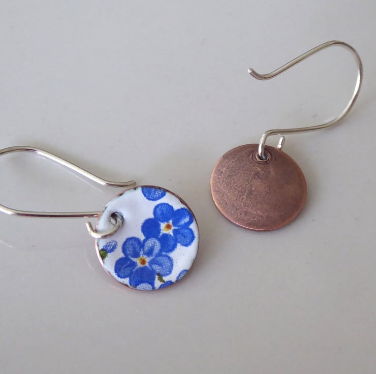 White enamelled disk earrings, decorated with forget-me-nots, suspended from handmade sterling silver earring wires.