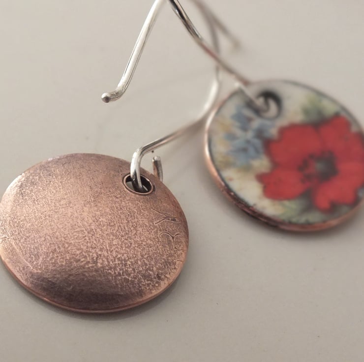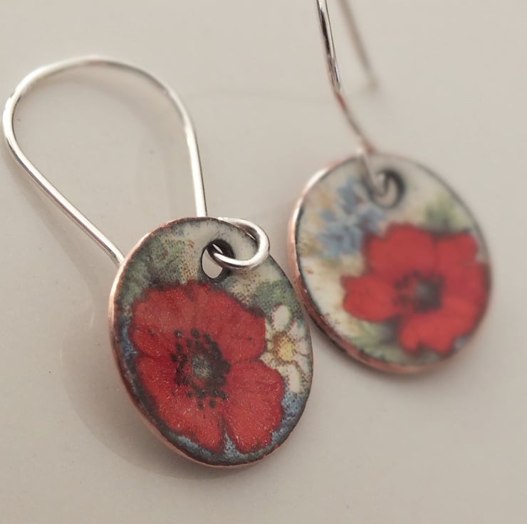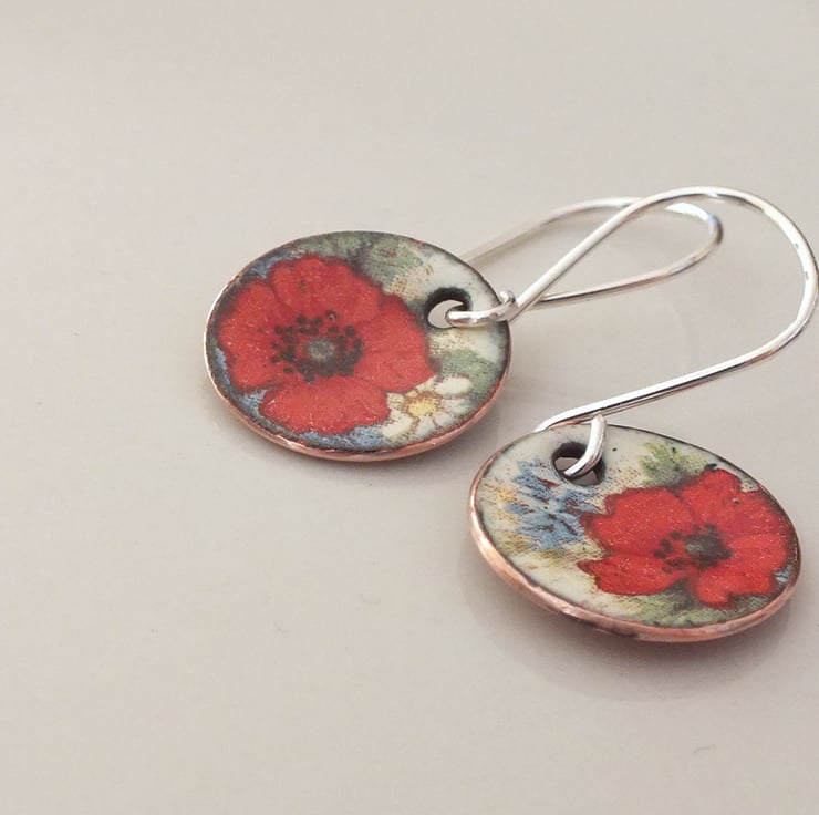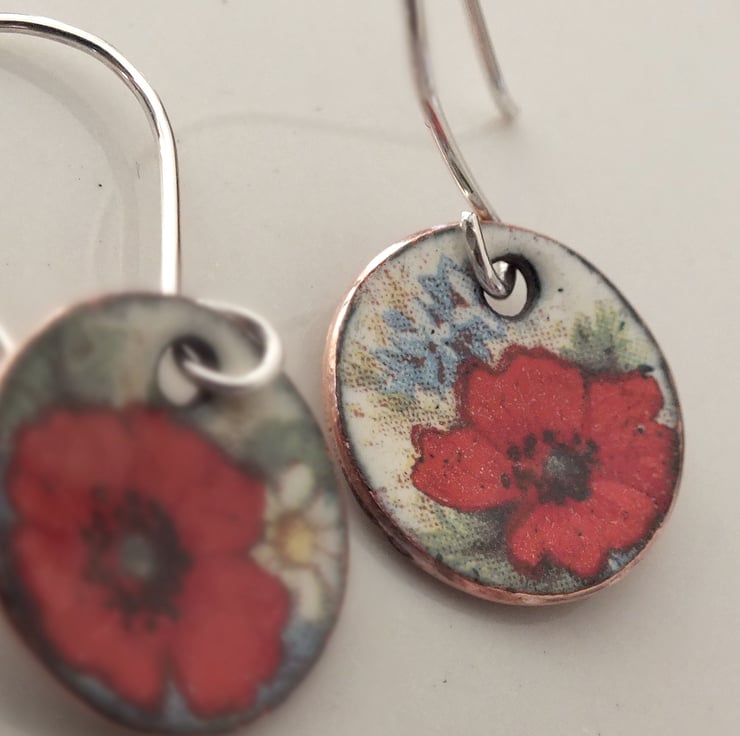 Enamelled disk shaped drop earrings, decorated with poppies, suspended from handmade sterling silver earring wires.