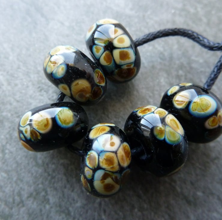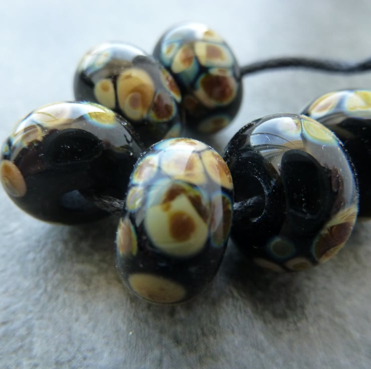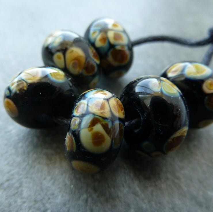 A set of 6 lampwork glass beads made with black glass and rolled in raku frit.
