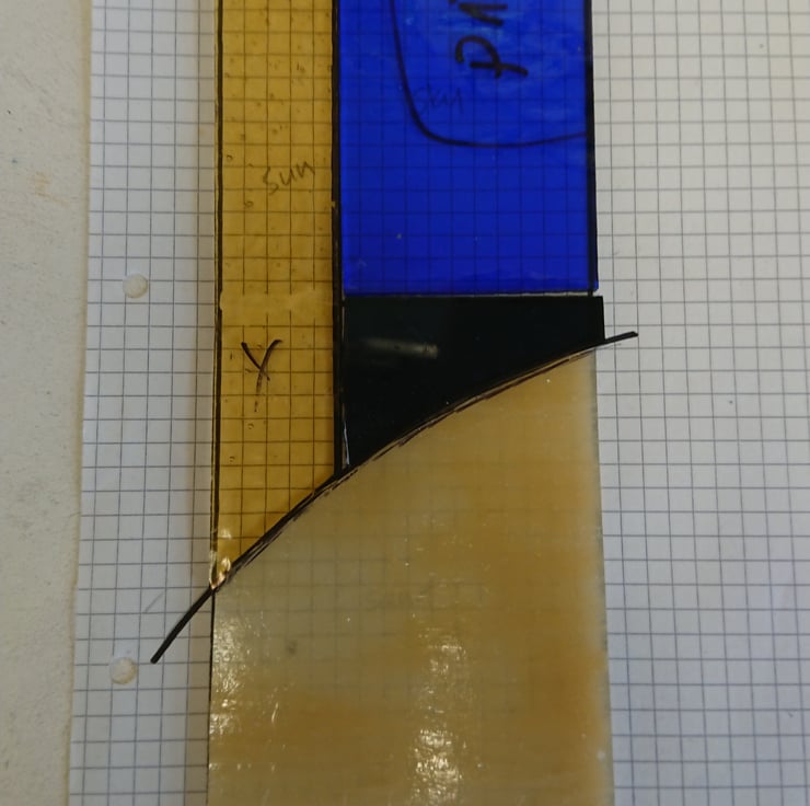 The sandy beach forms the main piece in this panel. It has been cut from a lovely swirled cream/sand coloured glass, the sun is a bubbly, textured pale amber, the sea a smooth deep blue and the sky a slightly rippled bright blue.