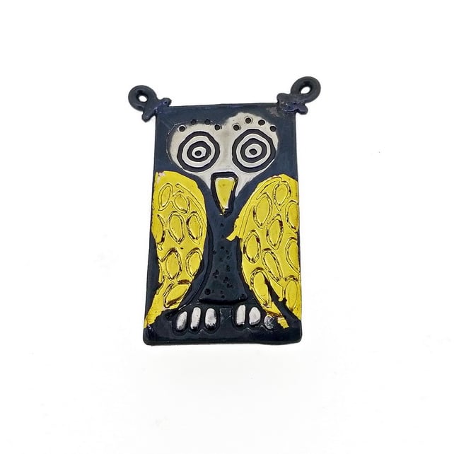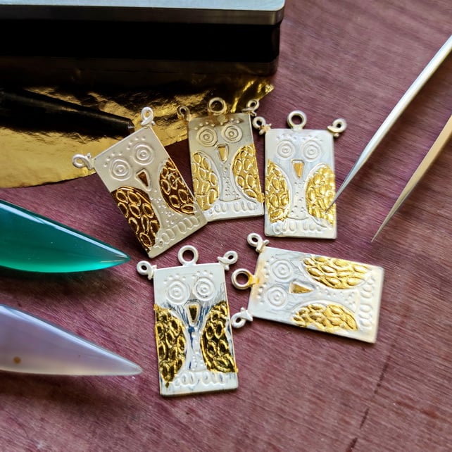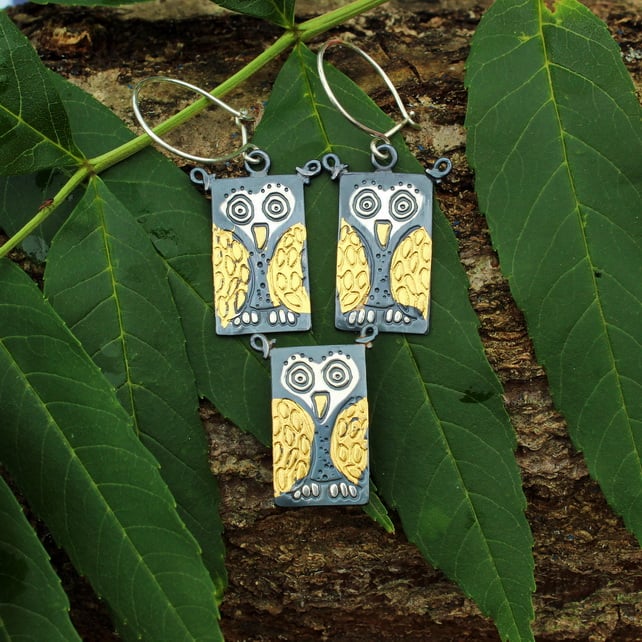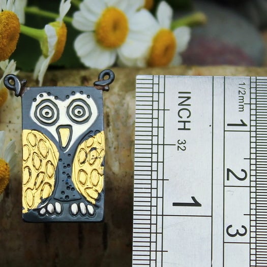 This little Owl brooch/pin is handmade by us in our workshop in Yorkshire. It is made from sterling silver and 24-carat gold and measures 20mm x 25mm. The technique used is an ancient Korean one called Keum boo, where gold is fused to silver at a high temperature. The brooch has a pin and catch on the back, similar to a tie tack. We also make a matching pair of owl earrings, which can be seen in one of the photographs above.