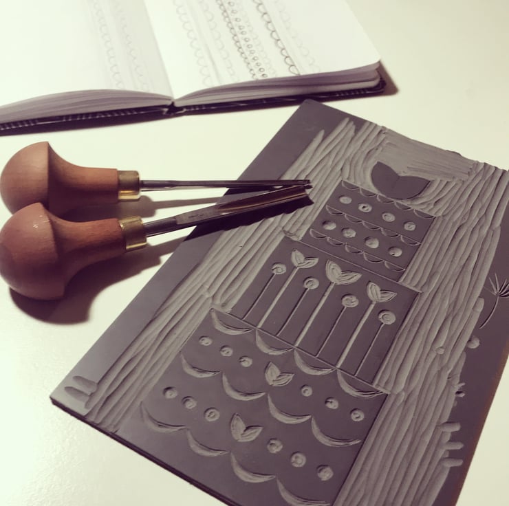 All my designs are created in my little studio by the sea and handmade by me. They all started life as a little sketch in my sketchbook, the designs are then cut in lino and printed by me so the patterns have a beautiful, simple block print style that is retained in the final card design.