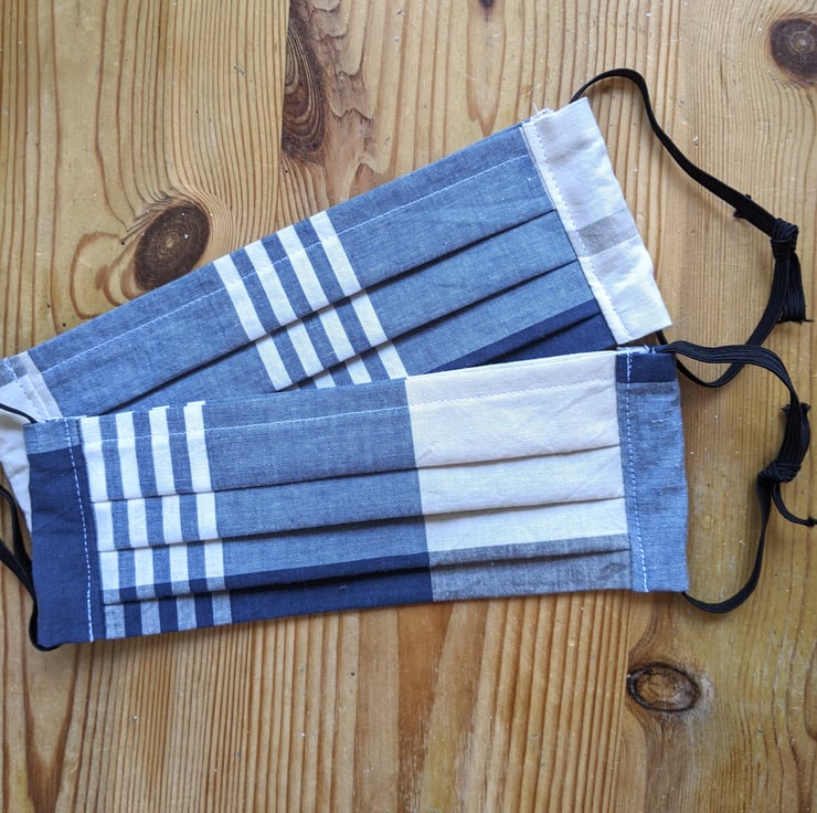 Handmade adult fabric face mask in a Blue and Cream Chequered fabric, with tied elastic so that it can be adjusted to your comfort. The elastic also goes through a channel at each side so that you can add ribbon/alternative cord to tie around the back of your head if wearing for a long time. (note: the elastic is in white or black, depending on what I have!)
