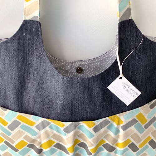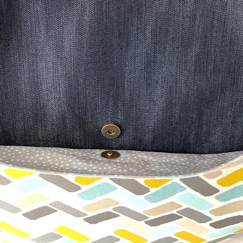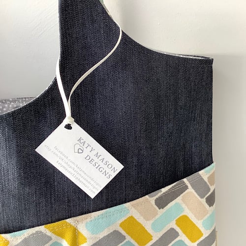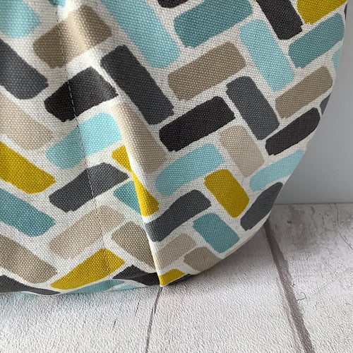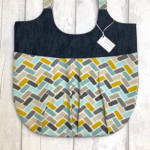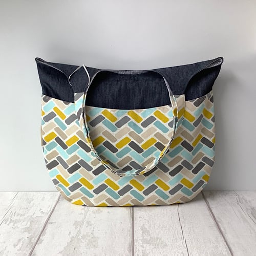 Slouchy style tote bag in a teal and yellow geometric print and denim combination. Fully lined in blue spot with an inside pocket. 42cm wide, 35 cm high, 63cm height to top of handles. Pockets on front and back. Magnetic fasteners for pockets and main bag.