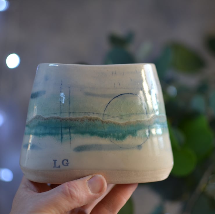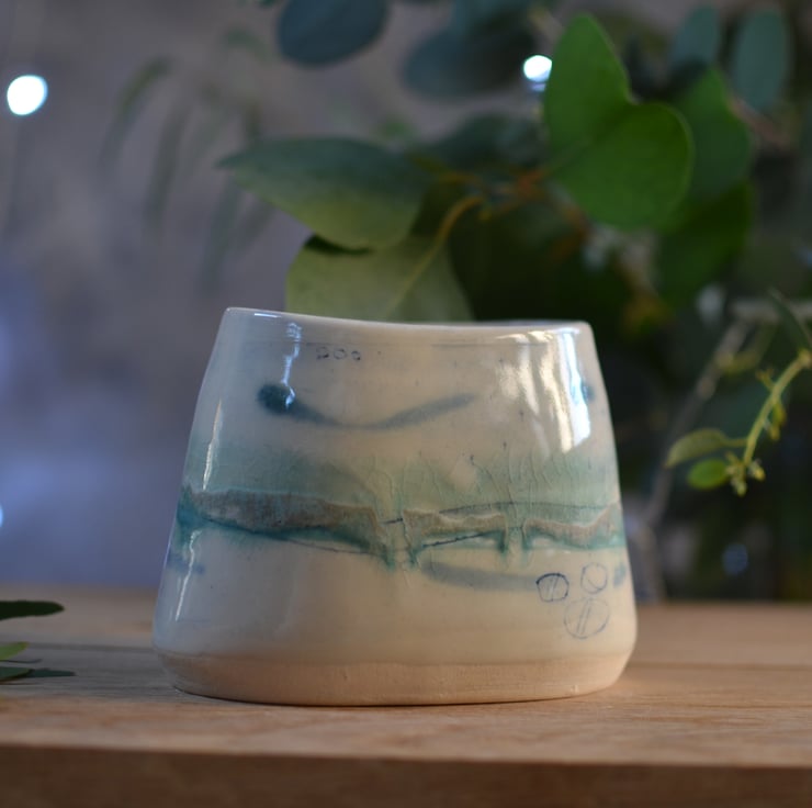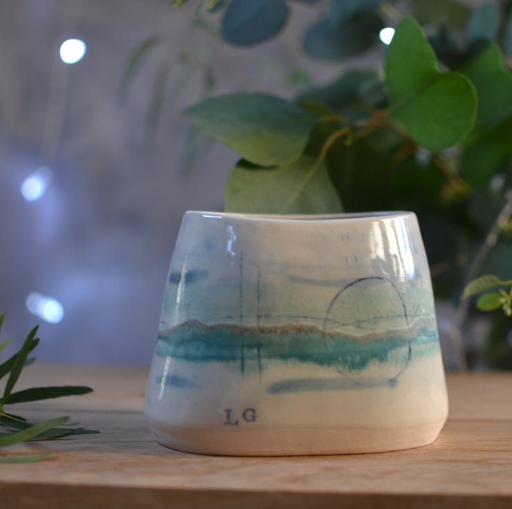 The ceramic pot is made from natural materials using as few resources as possible. With a mix of glazes and underglazes, it has a simple, undulating design that reflects the patterns of the ocean. Unlike most bowls, my seascape pot is oval, rather than strictly circular. It forms part of my Horizons collection of handmade pottery.