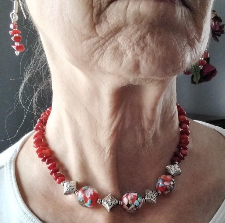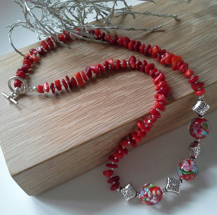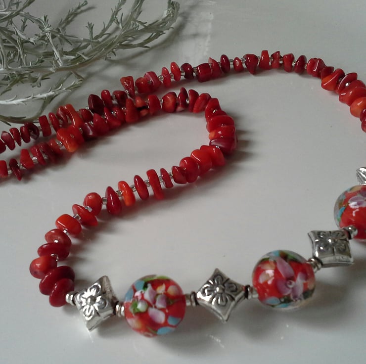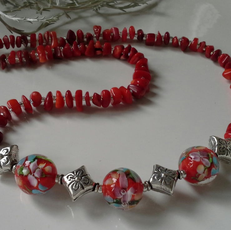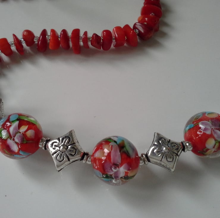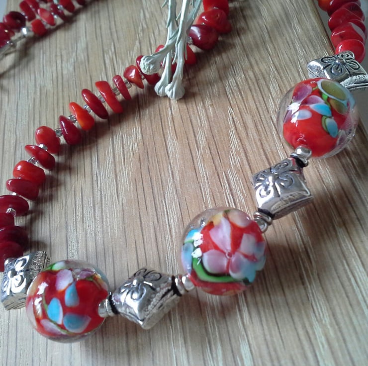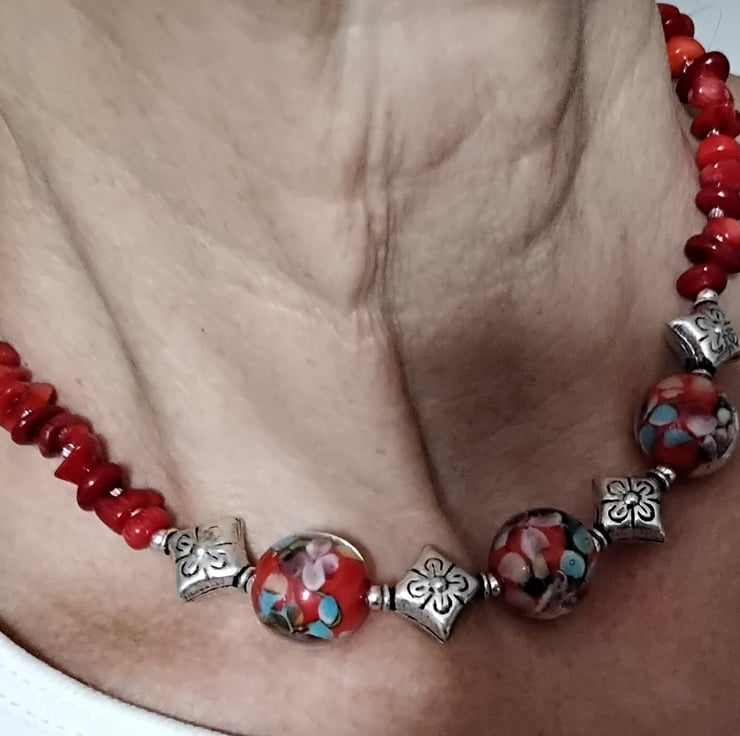 The necklace has has been created using genuine red coral (farmed and infused dyed) complimented with three beautiful unusual hand blown floral lamp work beads. Between then are hand made decorative tibitan silver beads. For the main instructions professional coated stainless steel jewellers wire has been used for added strength and lasting durability, finished off with a quality silver plated toggle style clasp. Between each coral nugget is a tiny clear seed bead to add sparkle around the neckline during wear.