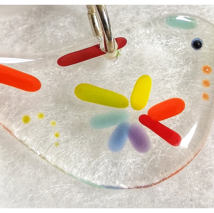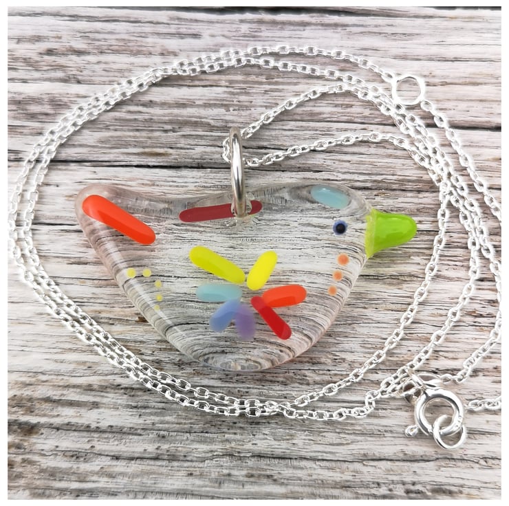 It is a summery pendant with lots of little colourful embellishments in a rainbow of colours so that it will go with most outfits. I love how the colour of what you are wearing shows through the body of the bird whilst the embellishments pop out at you.