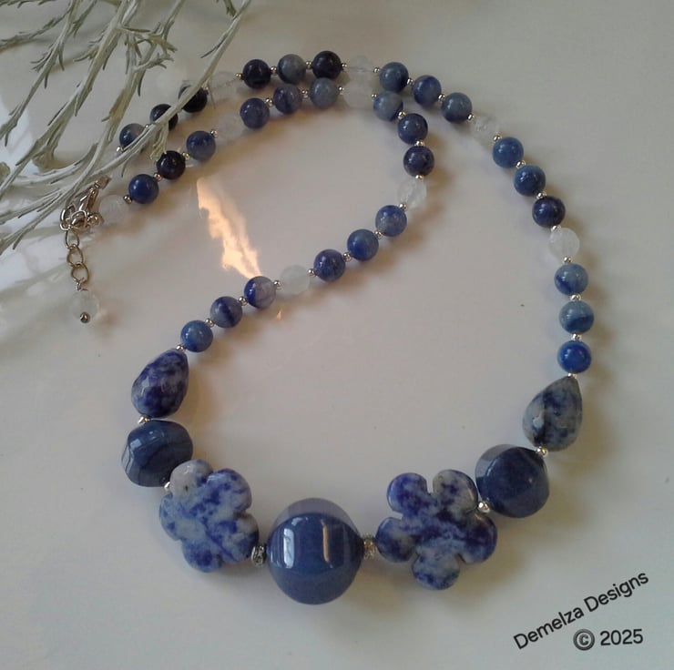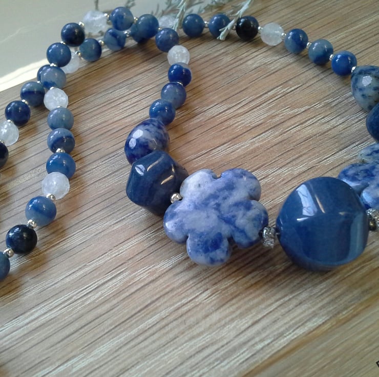 A stunning necklace designed and hand crafted using flower cut genuine sodalite, blue infused dyed lantern cut jade, spotted blue jasper and white agate gemstone beads. Flower and lantern cut shaped gemstones should not be underestimated as they can only be created by highly skilled lapidorists with years of gemstone cutting experience. They are also expensive gemstone bead cuts to purchase within the trade.