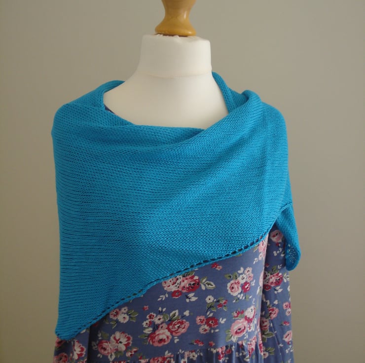 This turquoise bamboo/cotton wrap is beautifully soft and light. It features pretty eyelets along two sides for a decorative finish. It will make a much loved addition to your wardrobe, or a wonderful gift, and is the perfect accessory for many different occasions. It has been lovingly handmade on a domestic, hand-operated knitting machine.