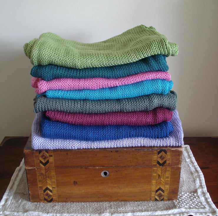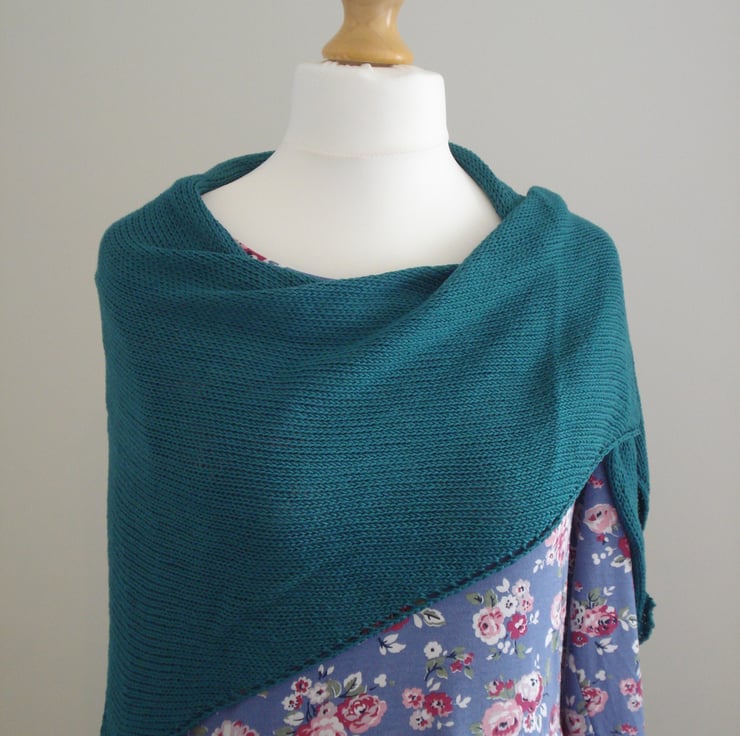 This bamboo/cotton wrap is beautifully soft and light. It features pretty eyelets along two sides for a decorative finish. It will make a much loved addition to your wardrobe or a wonderful gift, and is the perfect accessory for many different occasions. It has been lovingly handmade on a domestic, hand-operated knitting machine.